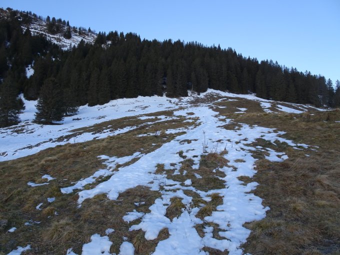 Gerade genug Schnee um die Schneeschuhe am Parkplatz anzuziehen. Schneedecke war krustig gefroren. Auch die Spur, die oberhalb vom Skilift besser ersichtlich war, war hart und tragend. Bis zum Sisitzgrat gute Spur(en) vorgefunden; dann bis zum Skidepot kaum Spuren aber gut machbar. Für Gipfelaufstieg habe ich die Alu-Steigeisen montiert. Rinne unterhalb vom Stahlseil ist ziemlich vereist; Stahlseil ist frei...