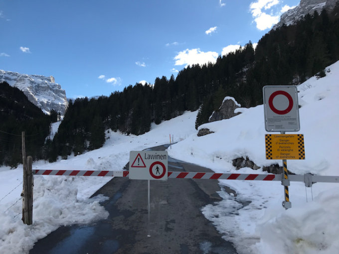Strasse ab Schwandboden gesperrt (s. Foto; soll anscheinend länger so bleiben). Aufstieg zu Fuss bis zur Glattalp Bahn. Abfahrt jedoch möglich.