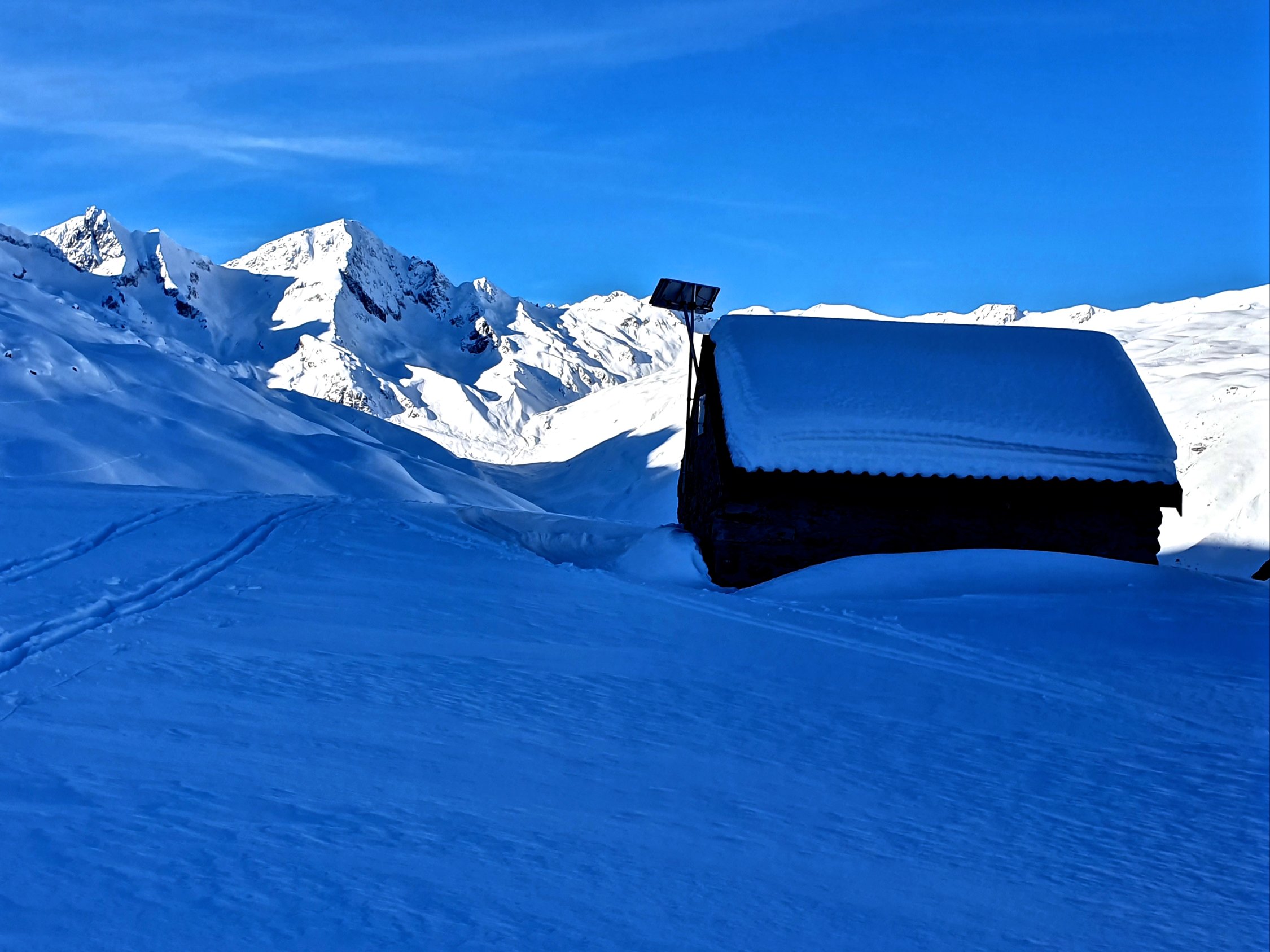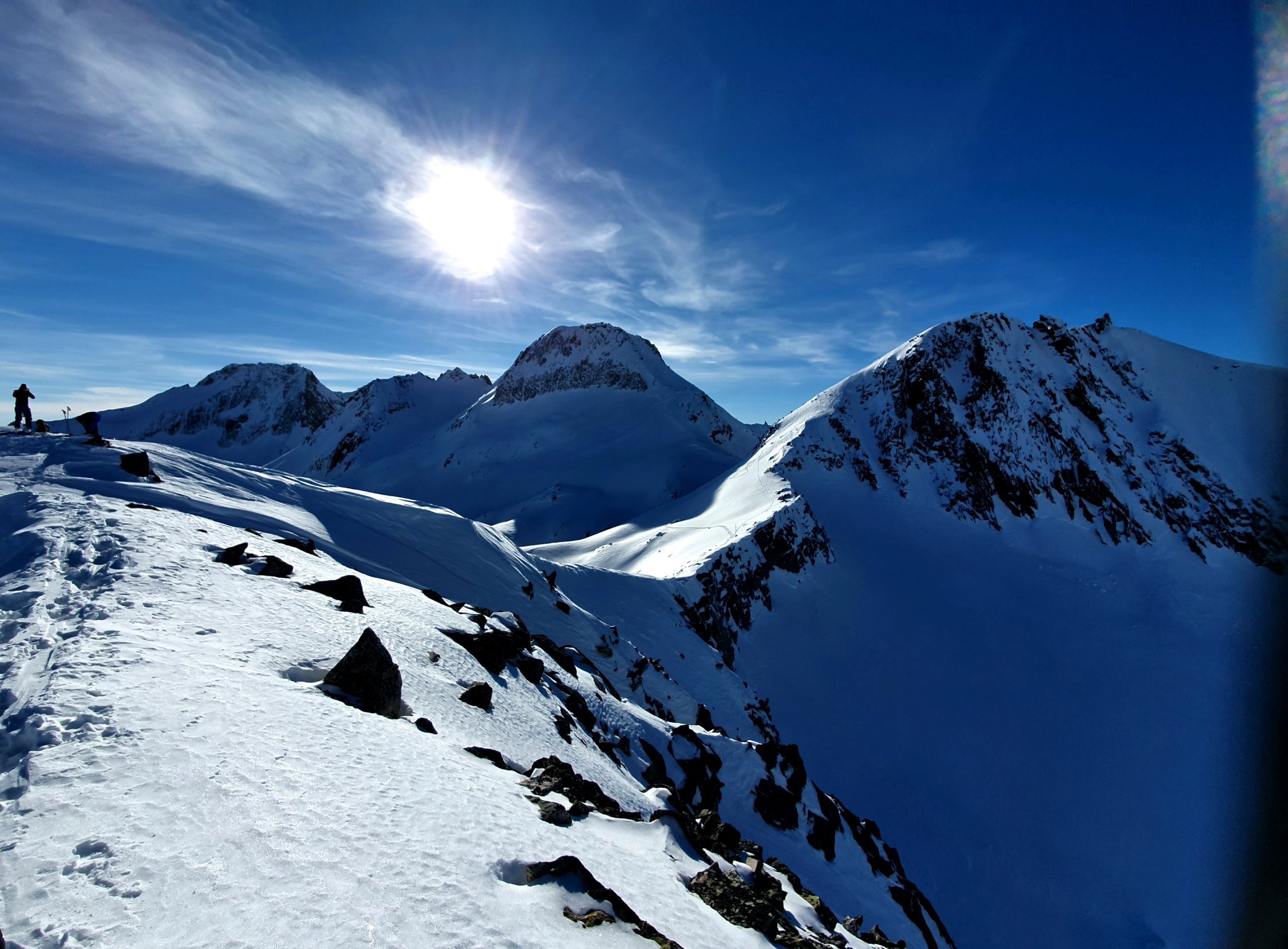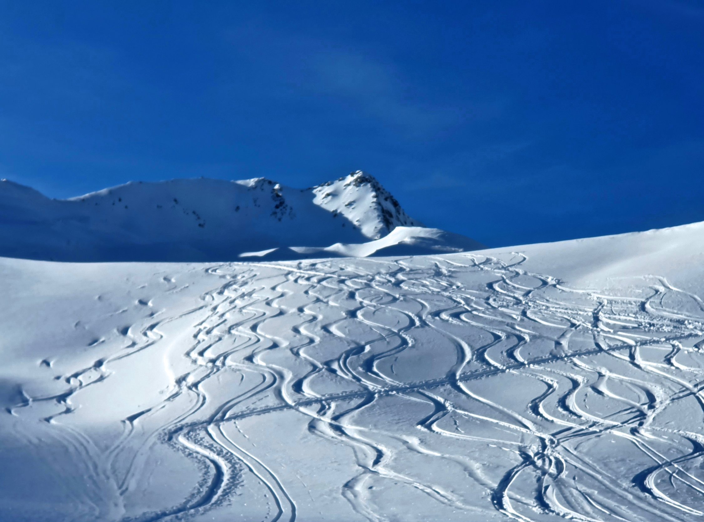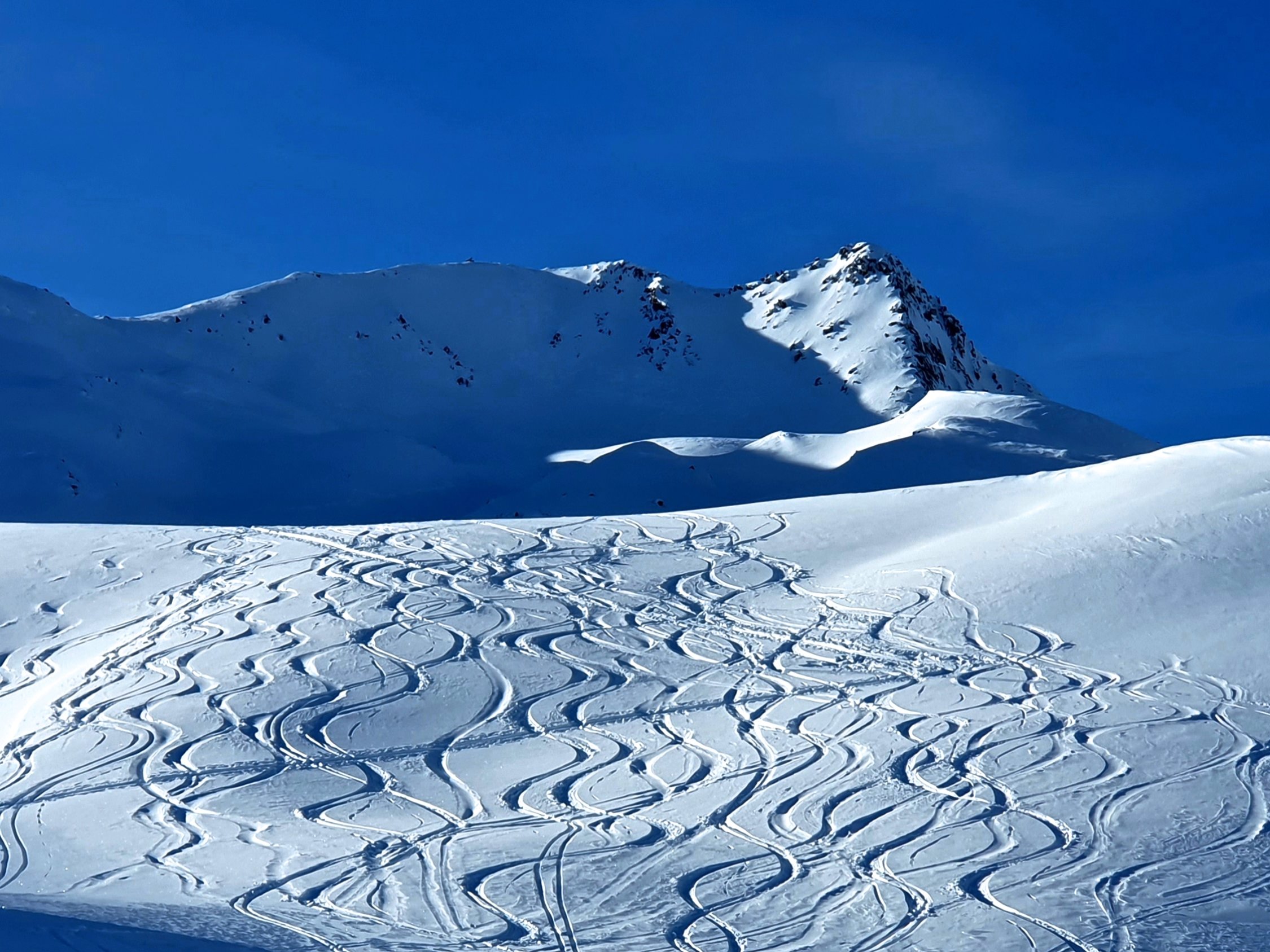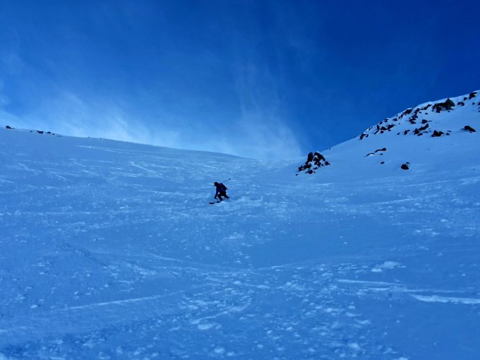 Der grösste Teil der Route liegt derzeit ganztags im Schatten, entsprechend kalte Temperatur. Deshalb noch wunderbare Pulverhänge angetroffen. An manchen Orten aber leichter Winddeckel. Die Steilhänge am Gipfel und unter dem Stelliboden schon ziemlich zerfahren, aber gut zu meistern.