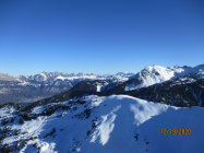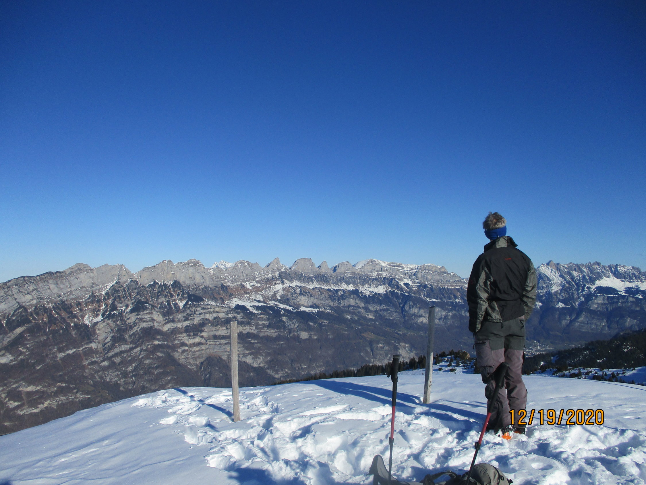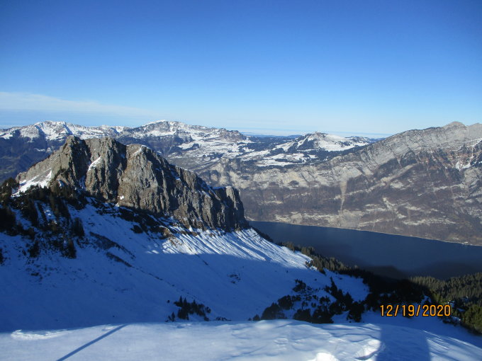 Prächtiges Inversionswetter, die Gipfel ragten in einen strahlend blauen Himmel. Nebeldecken über Bodensee und Zürichsee, der Walensee war allerdings nicht davon betroffen. Nach Süden hin offensichtlich stark bewölkt. Die Föhndüse blies etwas unangenehm, vorwiegend sowohl auf dem Kamm, als auch auf dem Gipfel. Plusgrade.