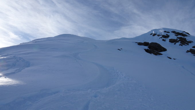 Der Gipfelhang war heute gut zu fahren mit 20-30cm Pulverschnee aber ab und zu halt ein paar leichte Steinkontakte deshalb immer noch mit Steinski zu empfehlen