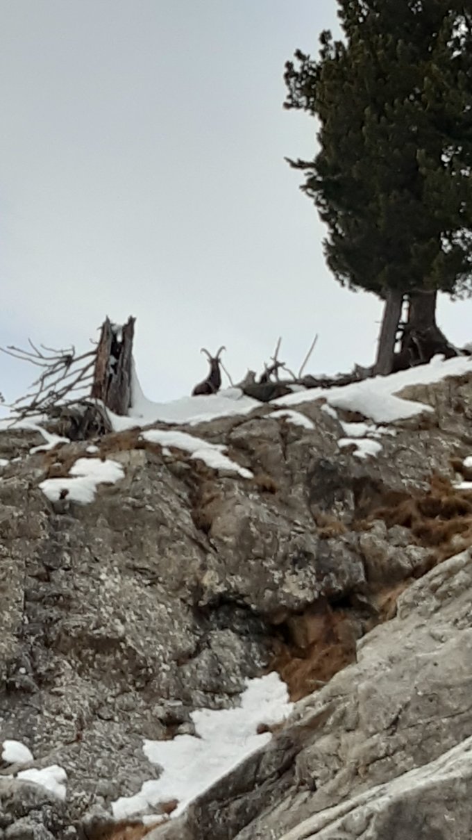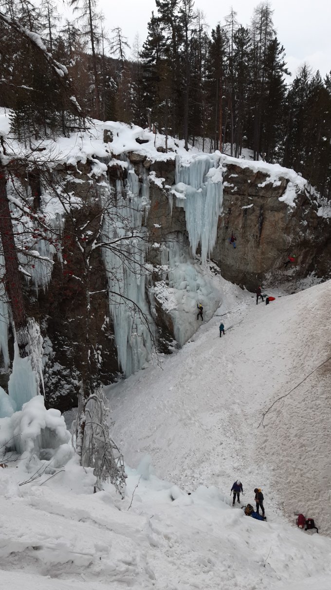 Der Fall steht noch nicht kletterbar. Morsches krüsi-müsi Eis und viel Wasser. Es ist einfach zu warm (Zustieg in leicht schwerem, feuchten Schnee - und es wird eher ein paar Grad wärmer die nächsten Tage. Wenigstens konnten wir beim Einstieg des Wasserfalls einen stolzen Steinbook beobachten - vielleicht sieht man es auf dem Bild.