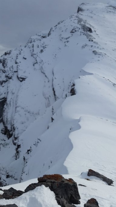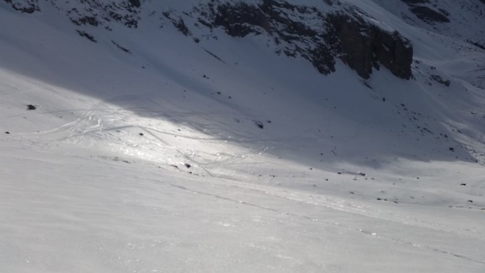 Wie längst bekannt: auf dieser Höhe keine Unterlage, der wenige Schnee ist in die Mulden verblasen – auch dort tückische Steine (Skier oft getragen, Schwünge vermieden, so ging's)