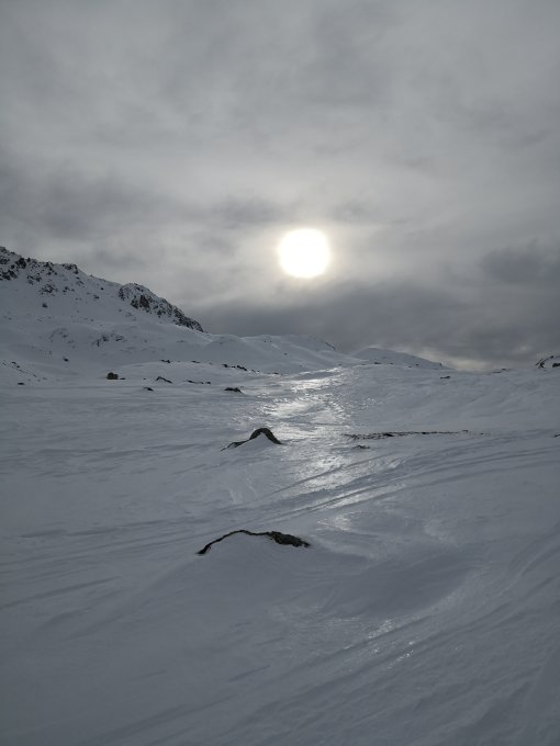 Eigentlich waren heute ideale Verhältnisse, toller Powder, zuerst auch wenig Wind und gutes Licht bei der Querung. Doch kurz vor Forcellina nahm der Wind markant zu und das Licht wurde sehr diffus. Oberhalb Forcellina dann sehr starker Wind, deshalb bei ca. 2700m umgekehrt. Abfahrt Richtung Septimerpass gemacht, jedoch viel zu lange auf der linken Seite runter gefahren. Besser wäre gewesen bereits oven nach rechts zu queren und den Pass anzupeilen. Wir mussten dann einige, teilweise schlecht sichtbare Mulden und Bachläufe queren, was sehr mühsam war. Der Schnee und die Hangneigung wären perfekt!