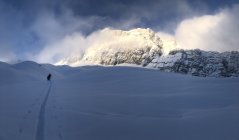 Start um 07:15 bei -5C und Schneefall. Unten ca. 15cm Neuschnee. Mit zunehmender Höhe und je nach Exposition bis Knietief oder mehr. Ab Alphütte sehr windgeprägt mit zum Teil hohen Verwehungen oder blankgefegten Teilstücken. Daher exportierte Steilhänge heute doch recht heikel.