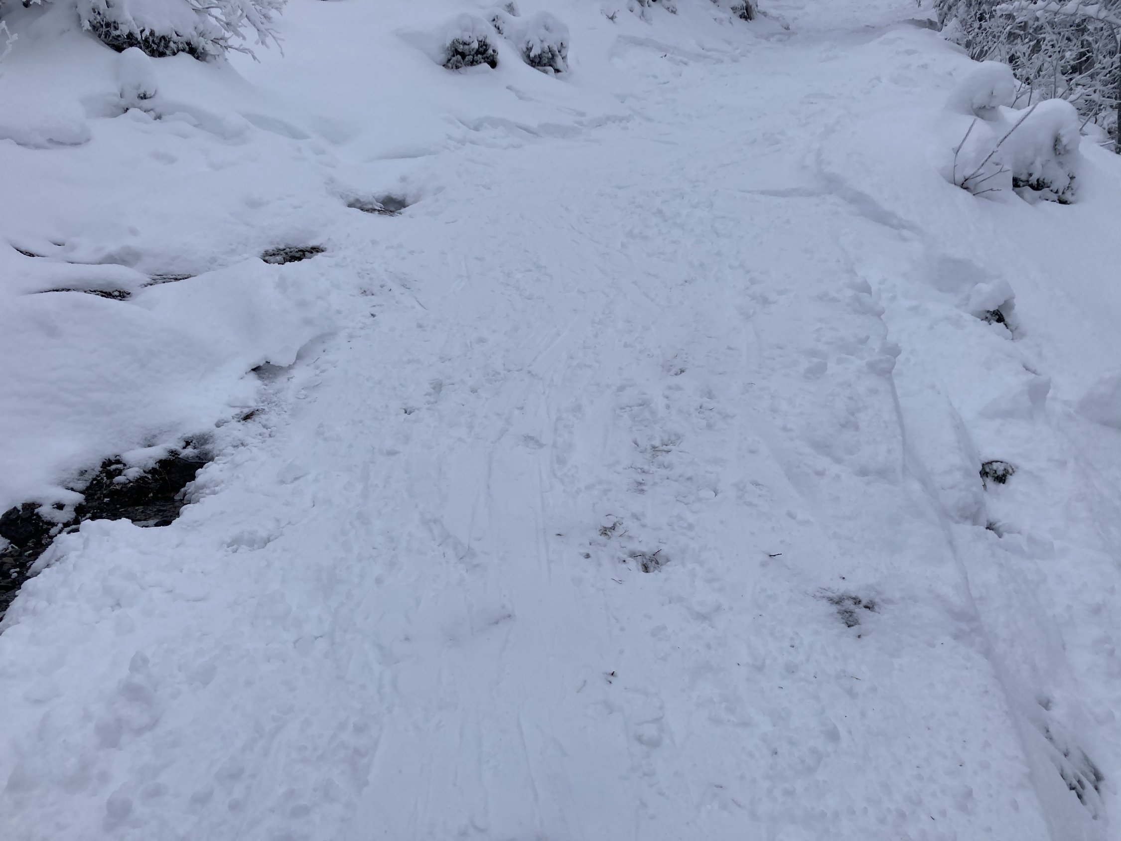 Schöner Pulver auf der ganzen Route. Vom Skidepot zum Gipfel guter Trittschnee. Schlüsselstelle bei 1650MüM gut eingeschneit, nur zuunterst sind ein paar Steine sichtbar. Steilhänge unter- und oberhalb Grossweid haben zu wenig Schnee für die Abfahrt. Wir sind vor Jäntli links runter und über den Waldweg zur Grossweid. Nach der Grossweid über Stafel hinunter zum grossen Parkplatz in Oberiberg