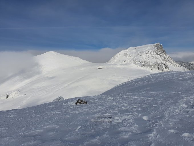 Es gab 25-30cn Neuschnee auf meist guter Unterlage. Der Grat ist praktisch leergefegt, der Schnee liegt in den nördlichen Hängen und in den Mulden. Wir waren heute auch deshalb wieder im Seeberg-Gebiet unterwegs.