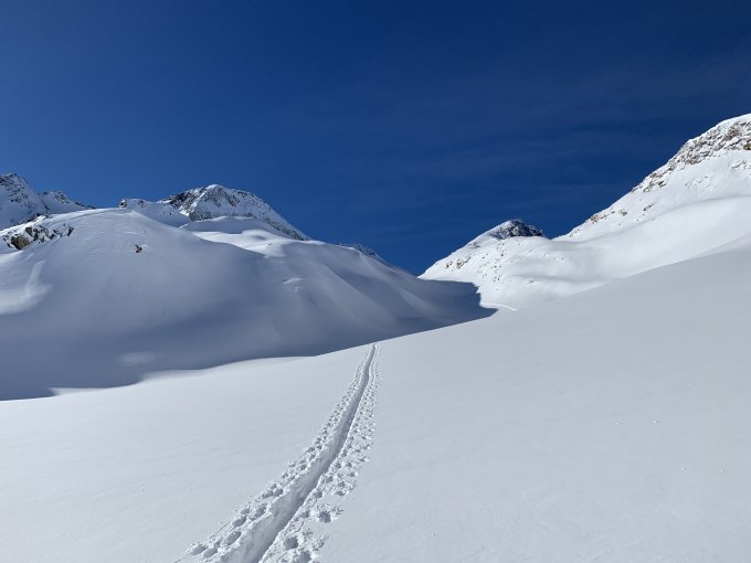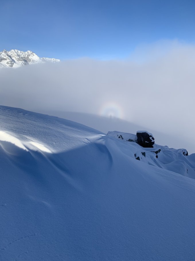 Recht kalt - die Sonne kam erst gegen 11 Uhr durch. Viel Spurarbeit bis Leckipass. Fast durchgehend schöne Pulverschneeauflage, oft zuviel des Guten, zudem recht stumpf durch die tiefen Temperaturen. Über Vorgipfel bis fast zum Hauptgipfel auf Ski gespurt, so gut eingeschneit habe ich es im Dezember die letzten Jahre dort nicht erlebt. Steigeisen & Pickel nicht notwendig, hatten wir auch nicht dabei. Abfahrt Muttengletscher schöner Pulver, Neigung einfach zu gering für grösseren Abfahrtsspass. Für den ausgegebenen 3er aber sicher korrekte Routenwahl. Aufstieg Stotzigen Pulver und Triebschnee im Wechsel, meist in 30 cm Schnee gespurt. Abfahrt Stotzigen oben passabel, unten raus dann eher murks. Unterhalb 2100 m hat es reingeregnet, dadurch recht verkrustet. 2 x schwache Wummgeräusche in den steileren Flanken des Leckihorns wahrgenommen.