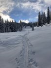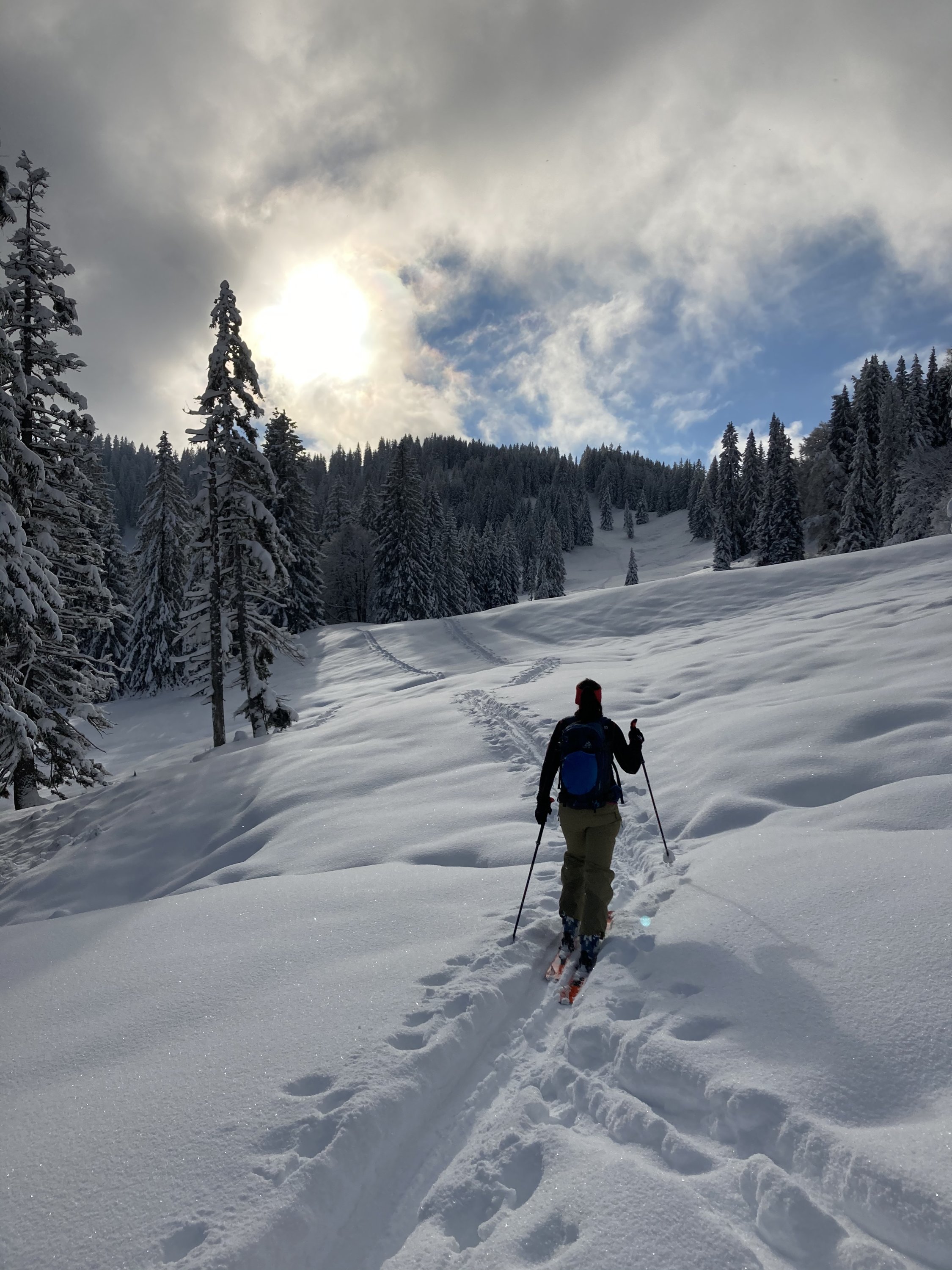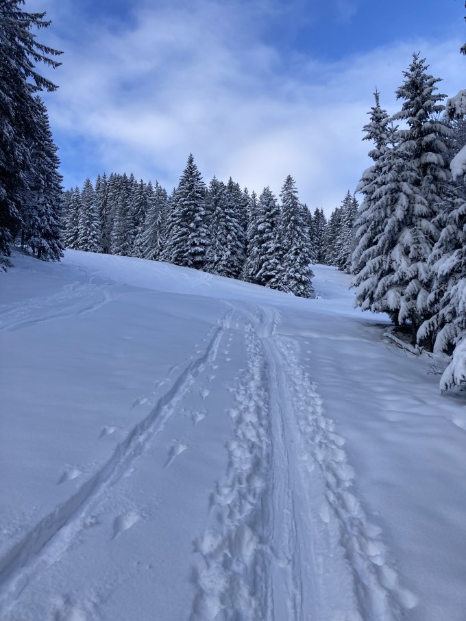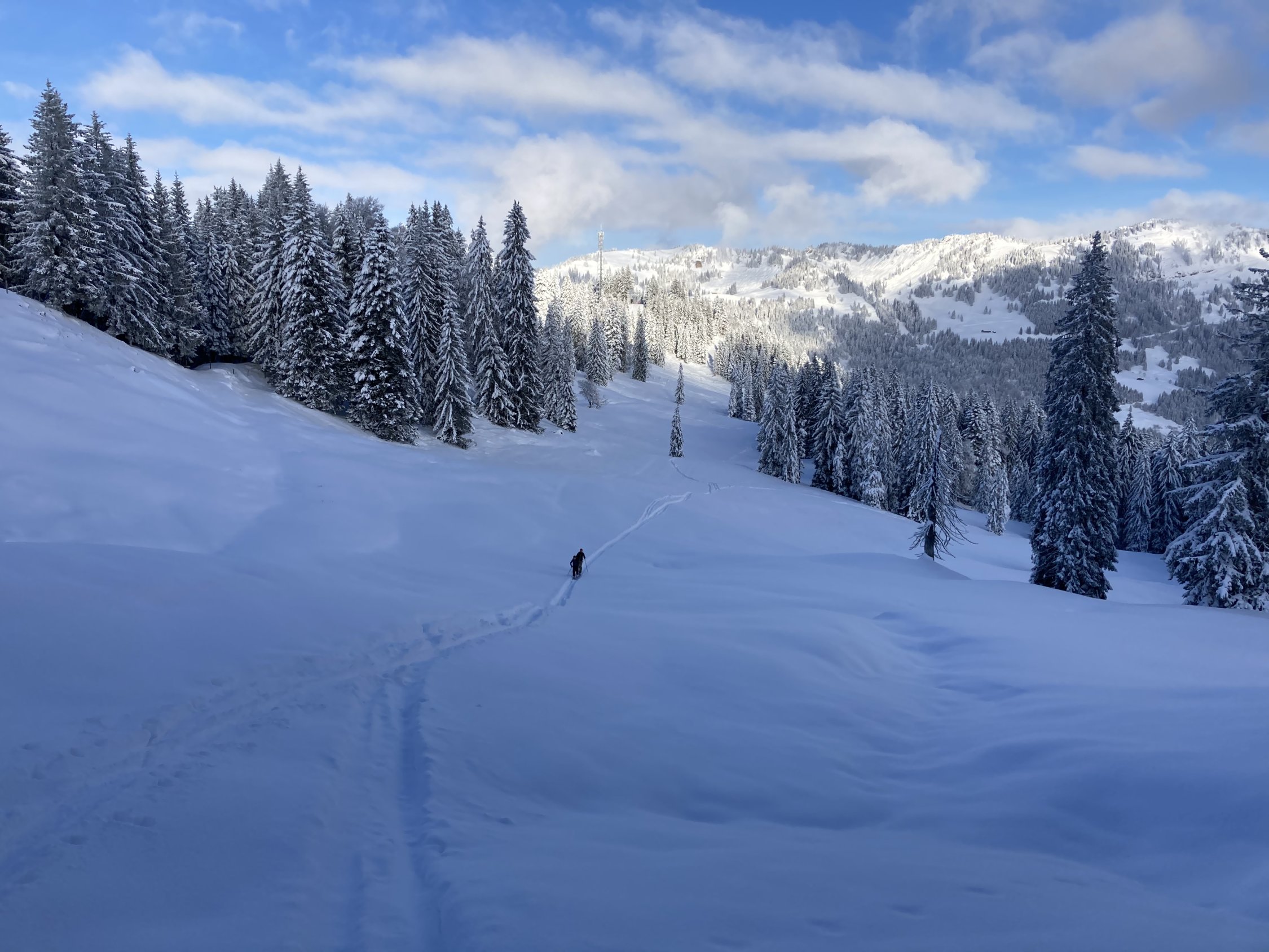 Gesamte Route guter Pulverschnee. Unten fehlt jedoch die Unterlage. Auf den Wiesen aber kein Problem und Kontakt, somit schöne und gute Abfahrt.