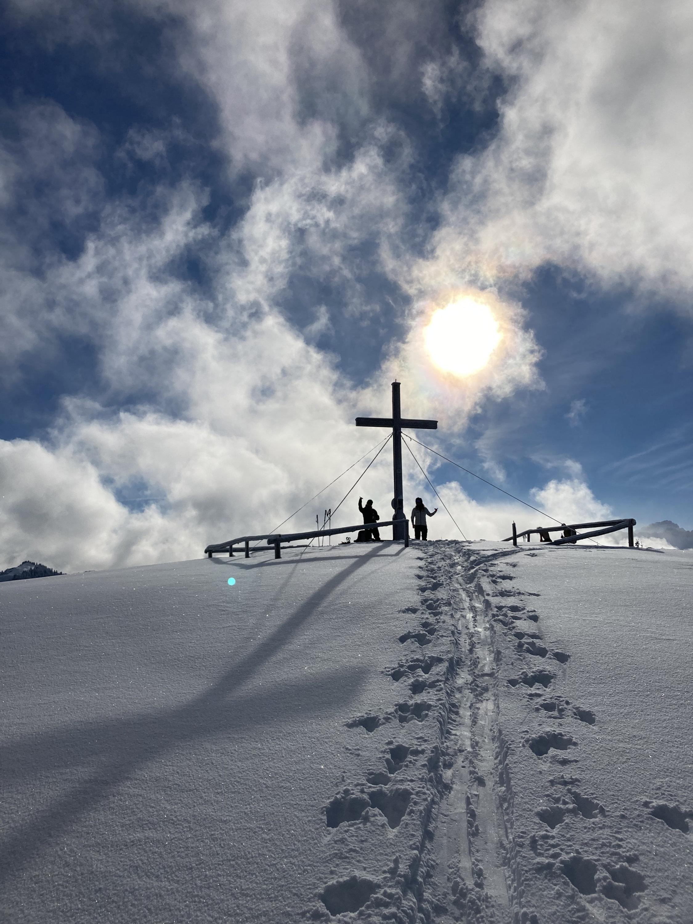 Gipfel linkshaltend weiter aufsteigen bis zur Bergstation der Hochschelpenbahn. Dann linkshalten auf den Grat und diesem nach rechts folgend zum Gipfel mit Gipfelkreuz. Ca 550hm. Abfahrt dann am besten retour und zuerst zur Käsehütte abfahren. Dann wiederanfellen und nach rechts zum Gelbhansekopf aufsteigen, danach Abfahrt zum Schwabenhof. 685 mit Gegenanstieg.