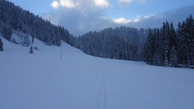 Ab Parkplatz Hintere Schönisei 1095m hat es bis 1500m 30-40cm Pulverschnee teils ohne Unterlage und oberhalb 1500m bis Gipfel 40-60cm Pulverschnee.