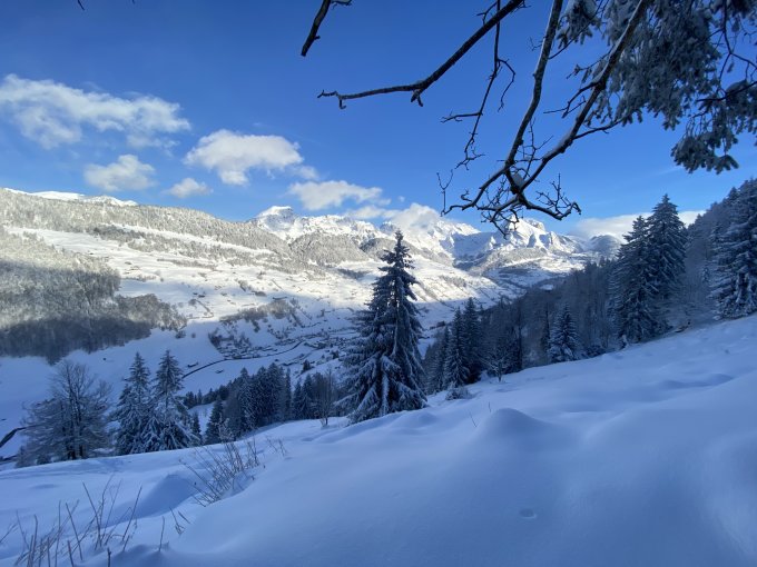 Vom Ausgangsort 887m bis nach oben rund 40cm frischen Pulverschnee. Ein Traum für jeden Türeler. Wir waren die einzigen weit und breit. Umso anstrengender war das Spuren doch die tief verschneite Landschaft und die Sonne hat uns sehr entschädigt. Etwas schwierig war der Einstieg in den Wald bei P. 1035. Man muss einen ziemlichen Bogen nach links machen um die schmalen Lücken im Waldabschnitt zu finden.
