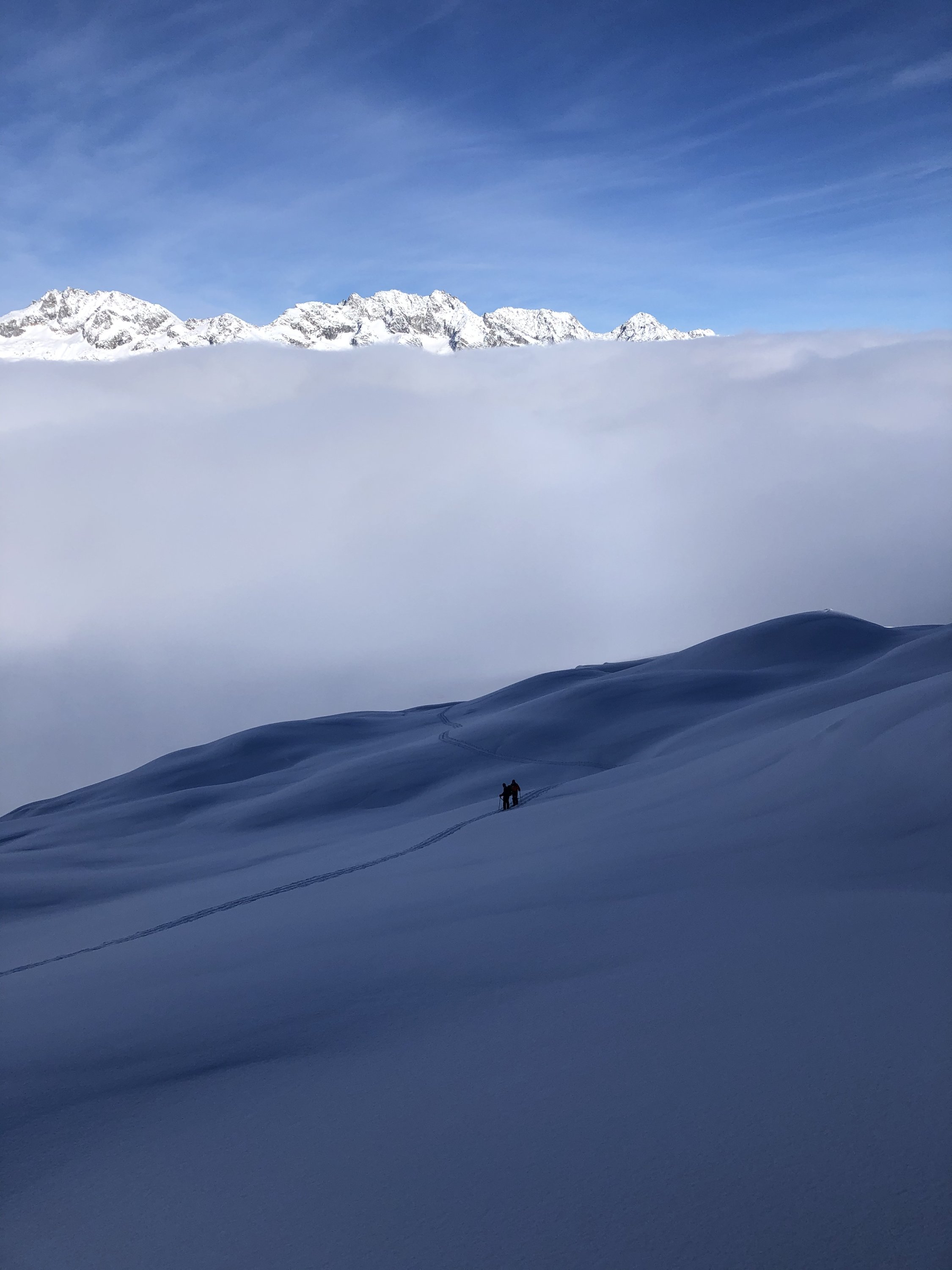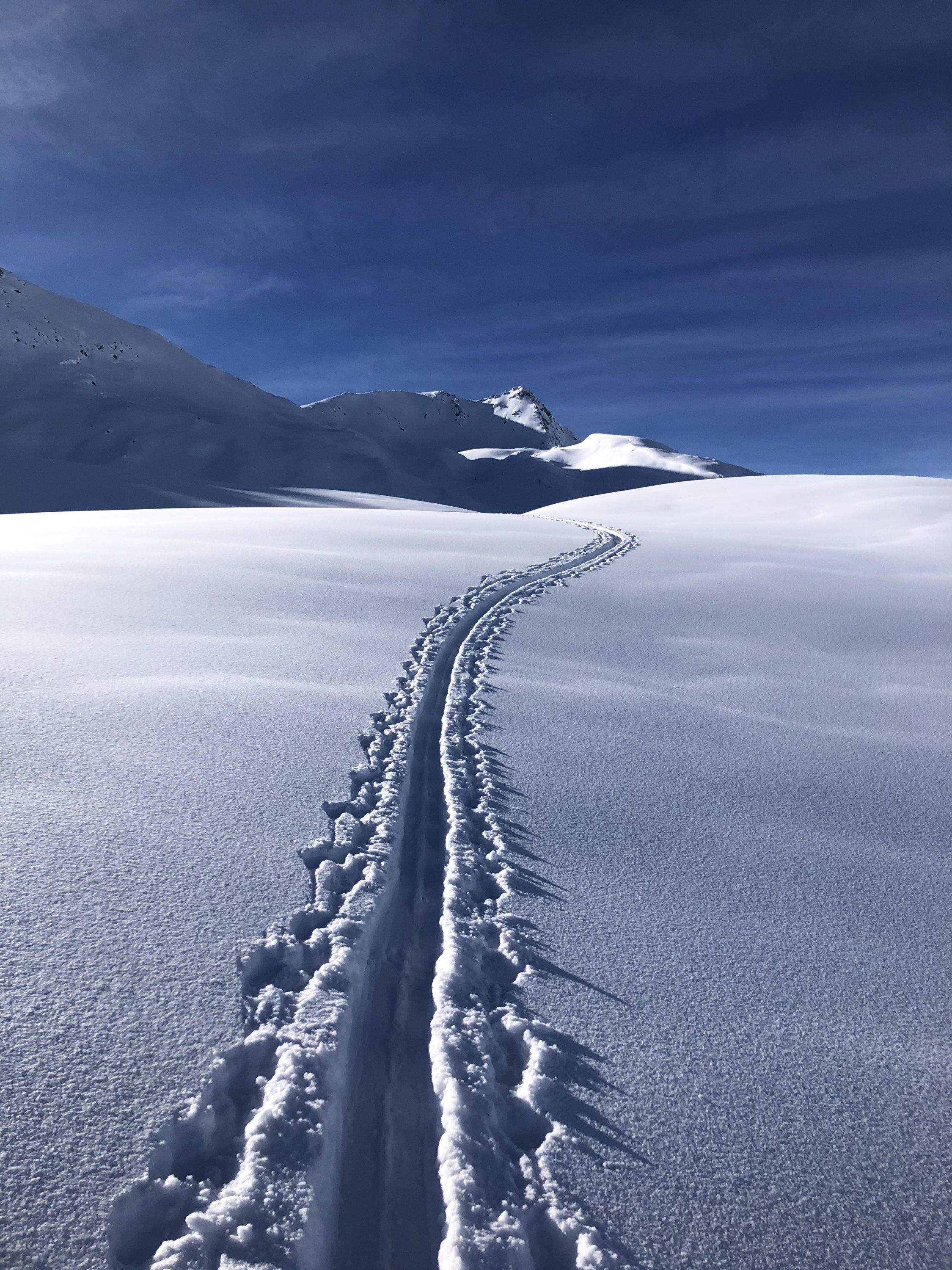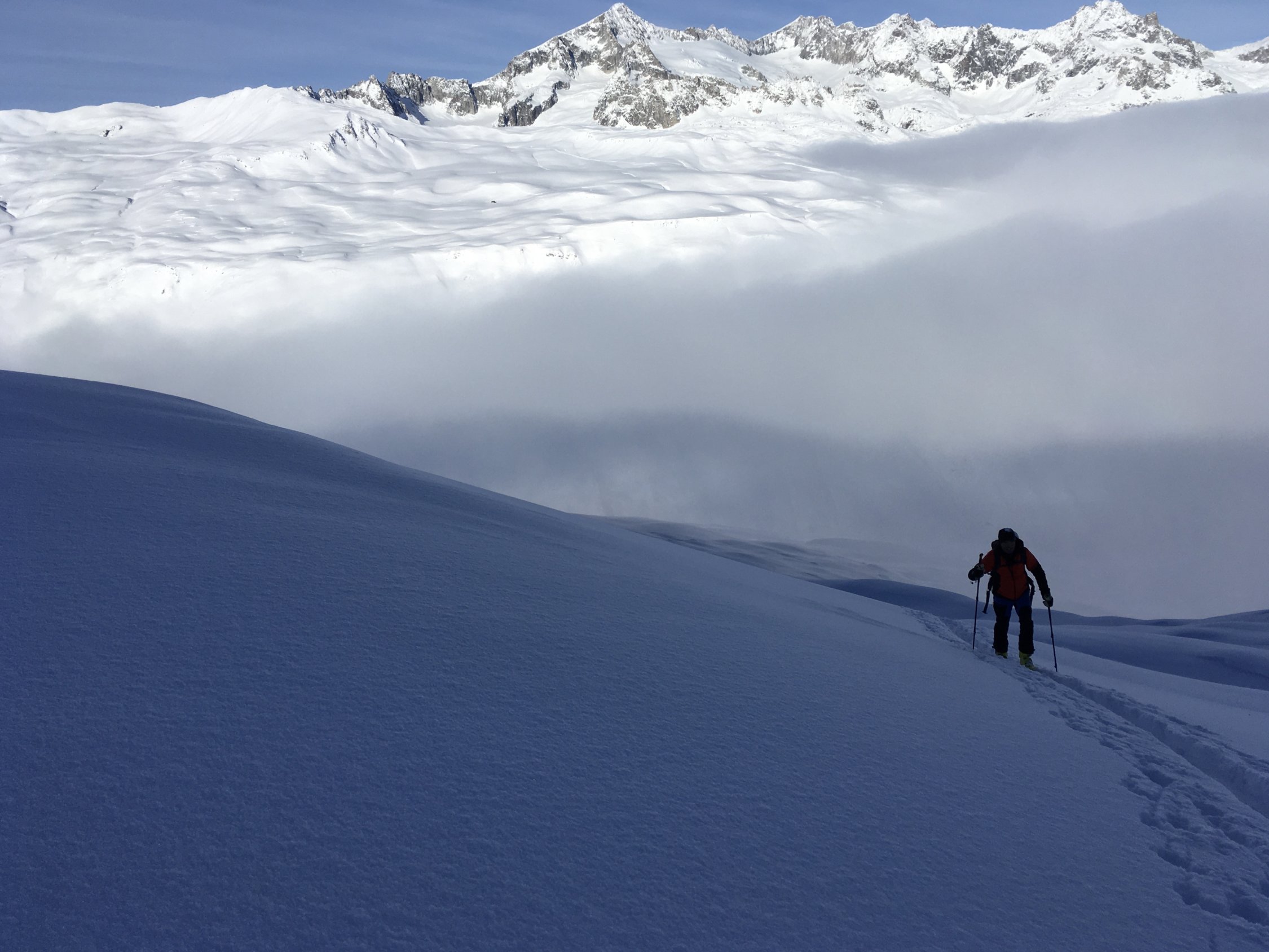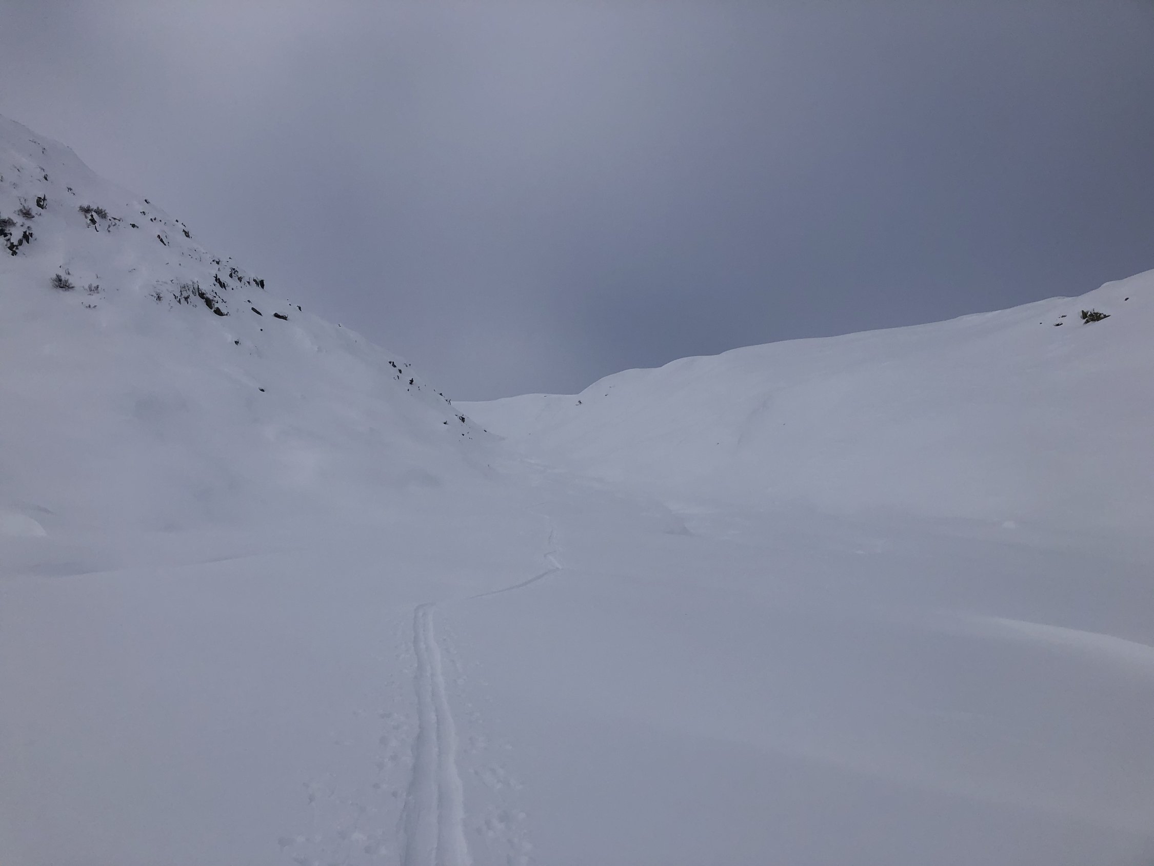 Mit dem Schneefall von vorgestern war für eine dicke Pulverdecke gesorgt. Da wir unter den ersten in Richtung RTH via Stelliboden waren, haben wir auch teilweise gespurt.