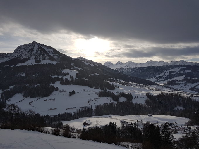 Zu Beginn besser der Schneeschuhroute folgen, der Hang oberhalb Oberrietli endet mit einem doppelten Stacheldraht!!! Danach über die freien Hänge oder Wege zum Gipfel. Abfahrt über Laub, Berg, Weidli, Brüggli.