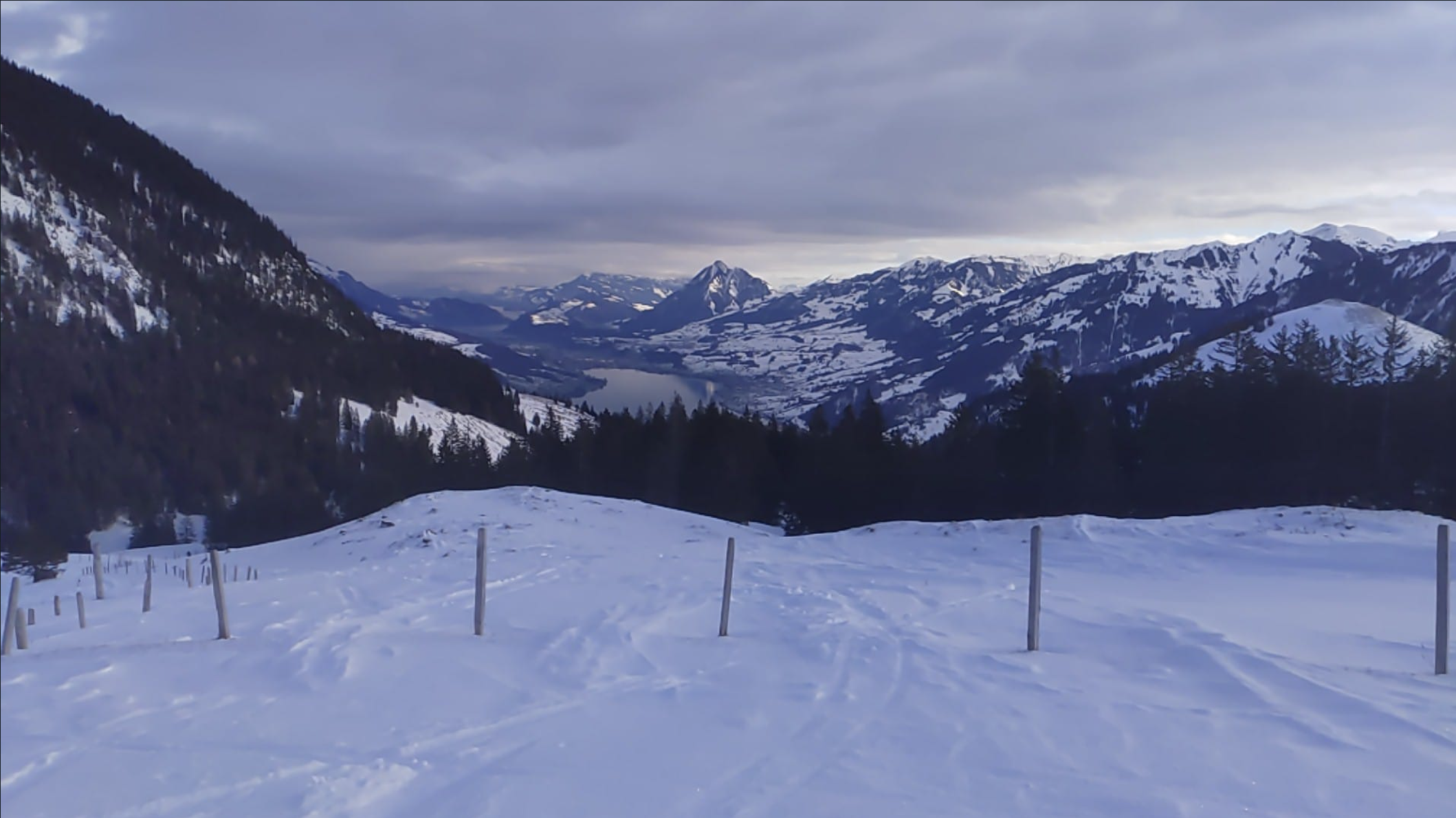 Heute morgen war das Wetter besser als erwartet und es zeigte sich die Sonne zwischendurch. Im Verlauf des morgens sind dann die Wolken und Schneefall gekommen.