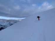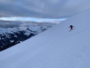 Der Hang ist schon gut verspurt worden, es hat aber noch genug Platz für weitere Schwünge. Die Aufstiegsspur ist sehr steil angelegt.