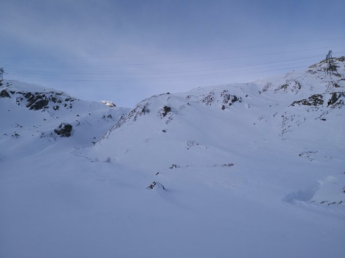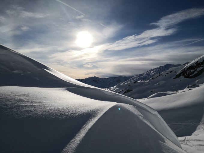 Der Wind war die ganze Zeit ständiger Begleiter, in Hospenthal - 13°, beim Skidepot dann sehr kalter Wind. Keine Pause gemacht, Abfahrt über Aufstiegsroute im Traum Pulver. Es hat noch genügend Platz für eigene Spuren.