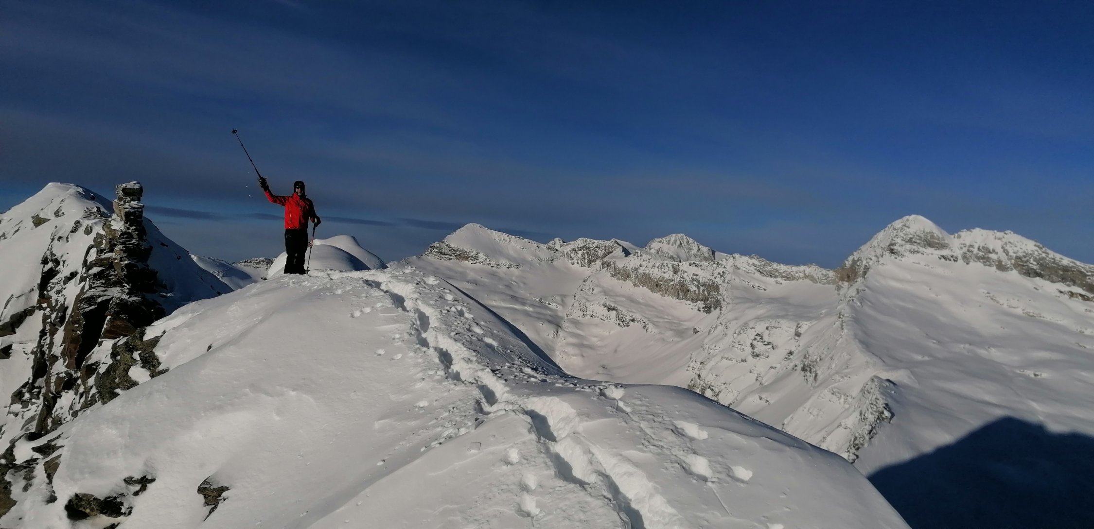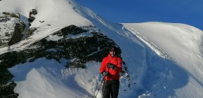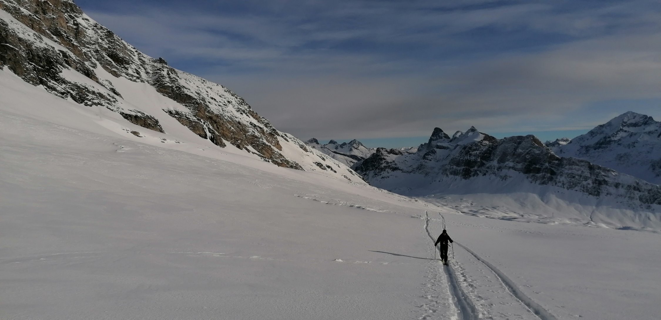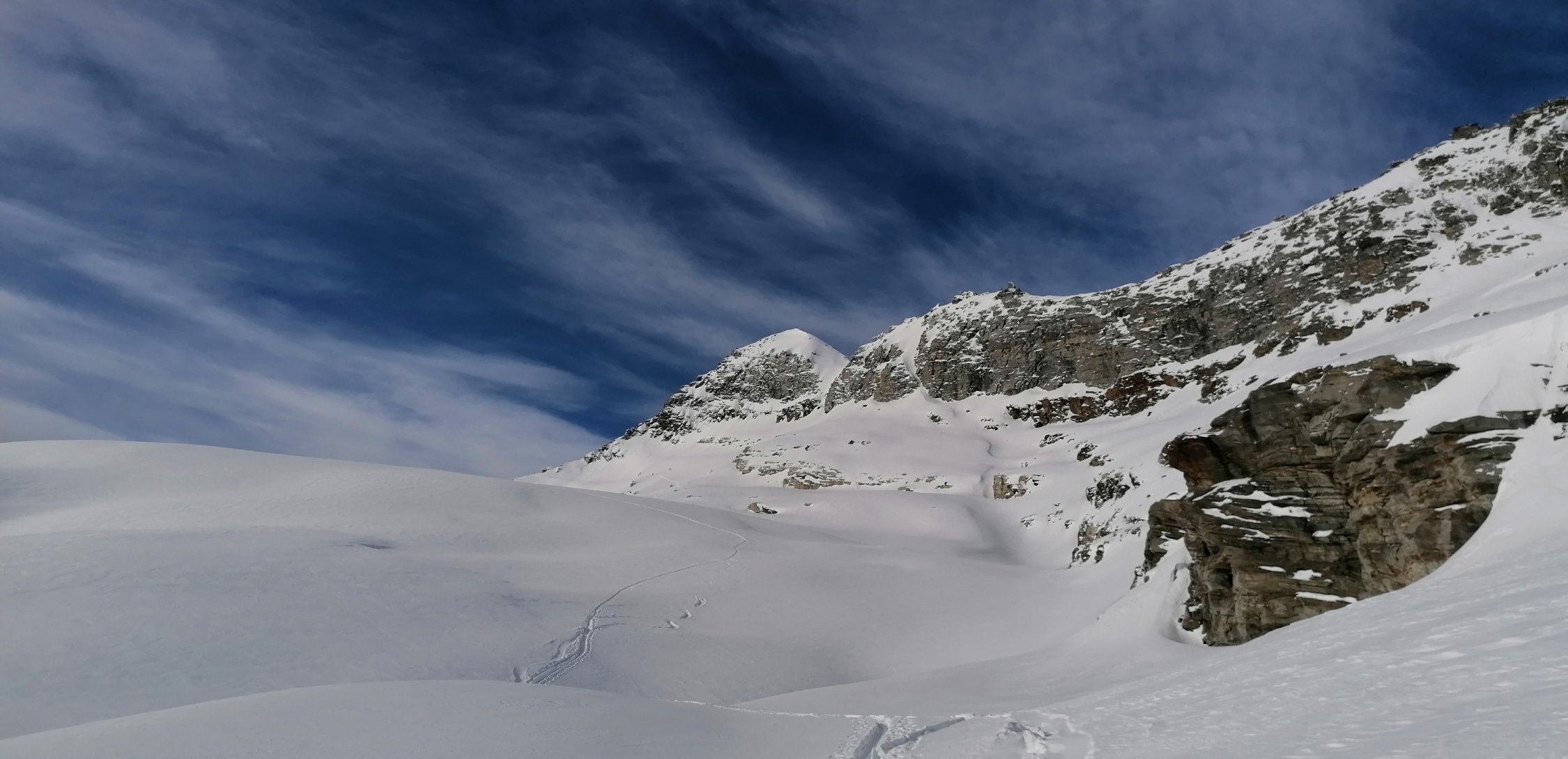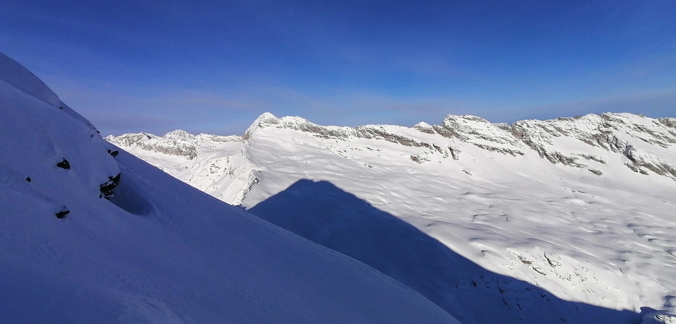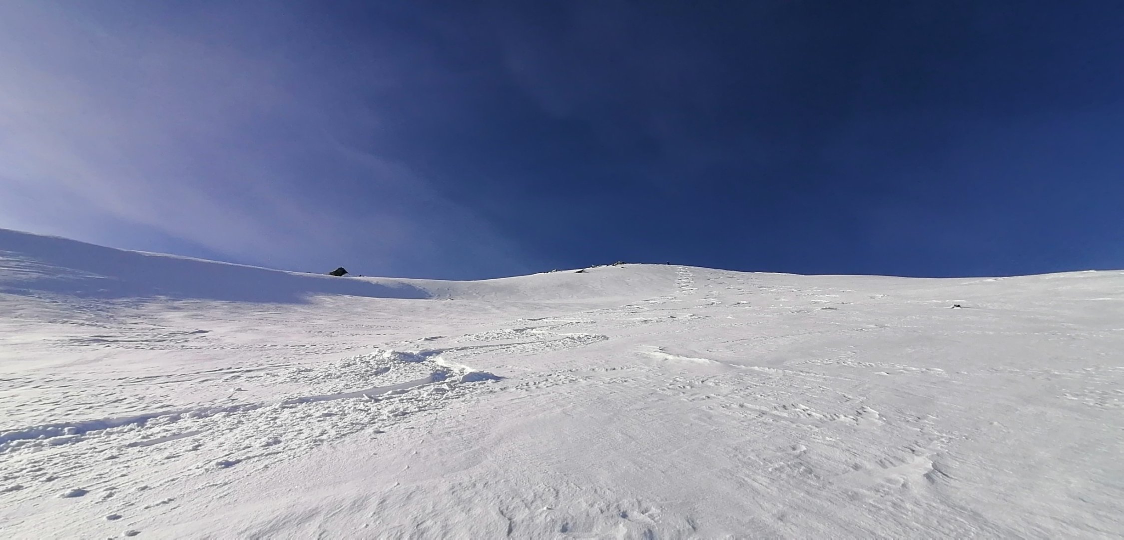Start um 6.20 Uhr bei - 15° Die 5 er Spur vom Vortag war ab 1900 müM über Nacht meist wieder zugeblasen, herzlichen Dank fürs Spuren. Zum Gipfel sind wir mit Steigeisen.
