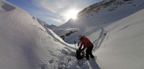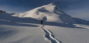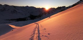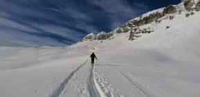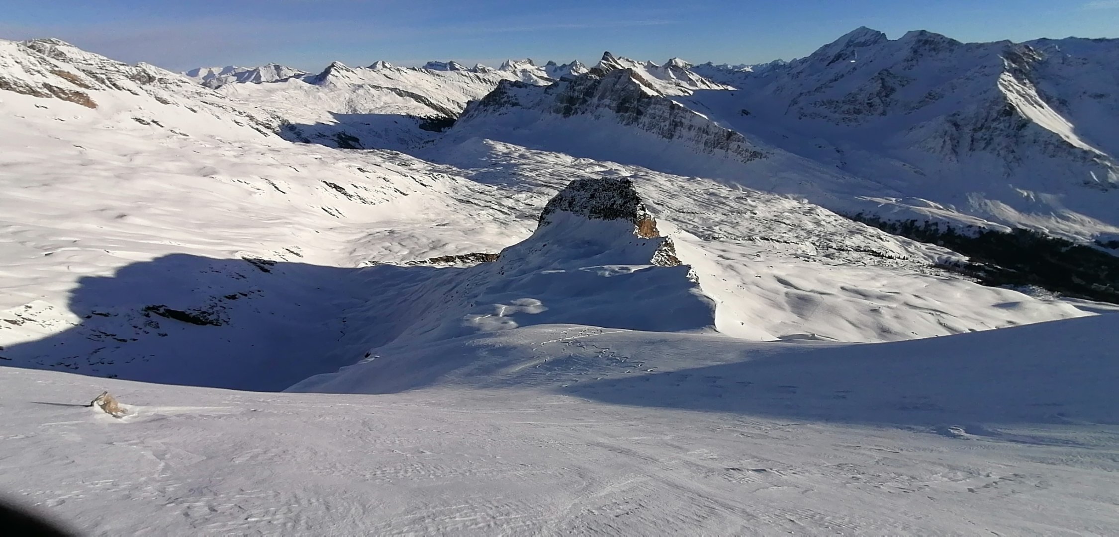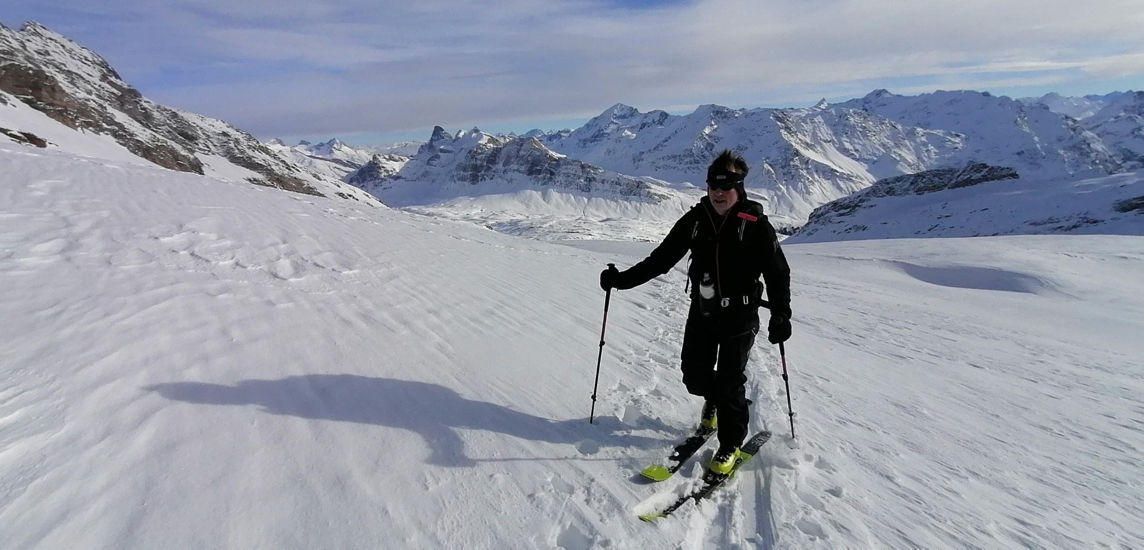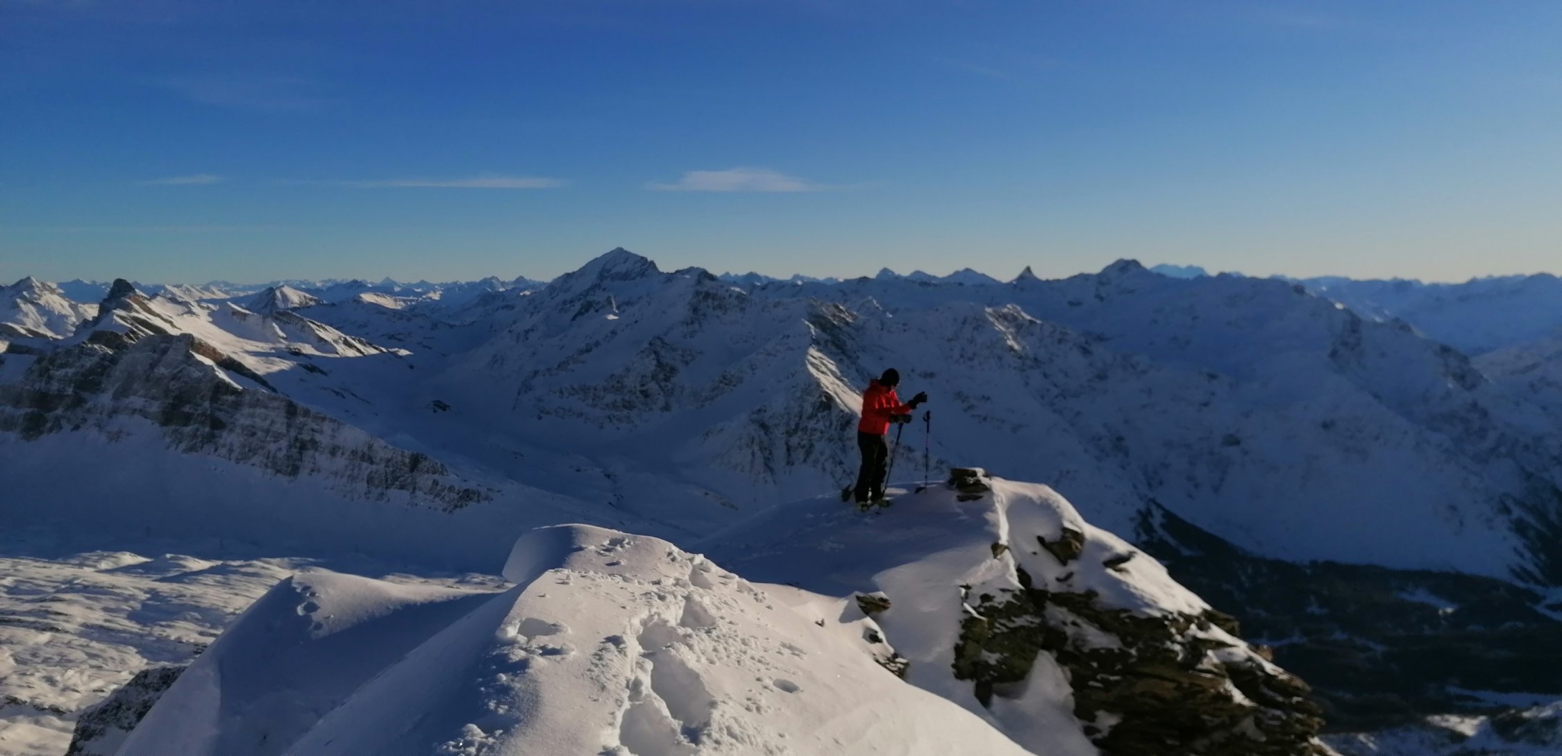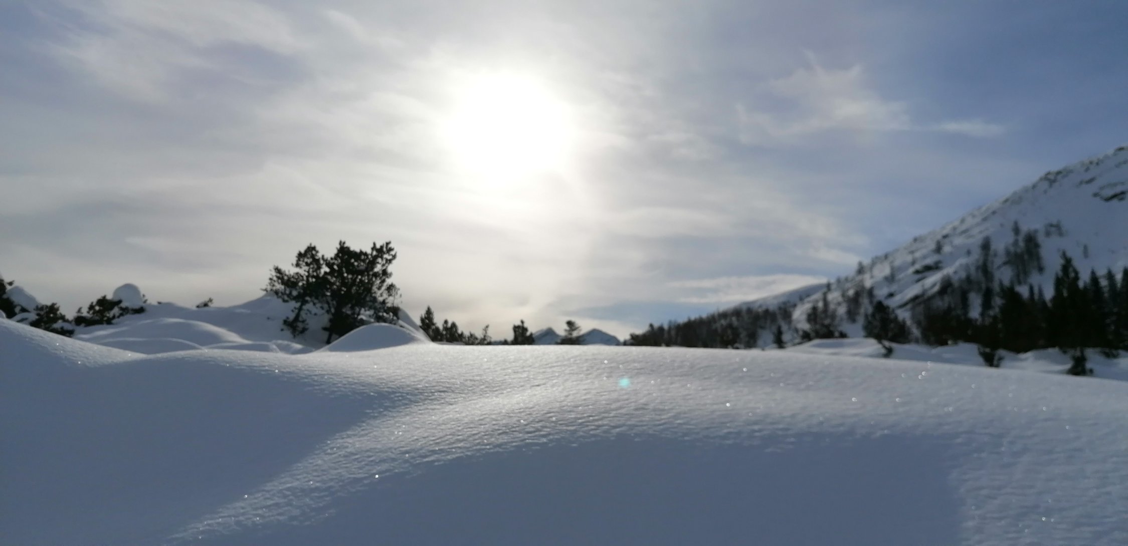 Start um 6.20 Uhr bei - 15° Die 5 er Spur vom Vortag war ab 1900 müM über Nacht meist wieder zugeblasen, herzlichen Dank fürs Spuren. Zum Gipfel sind wir mit Steigeisen.