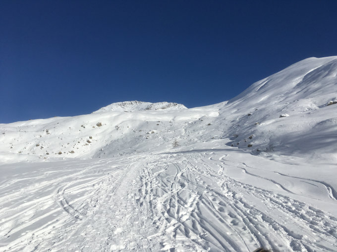 Noch überraschend gute Schneeverhältnisse in der Abfahrt, zum grossen Teil Pulverschnee. Achtung geben auf verborgene Steine, d.h. eher defensiv fahren.