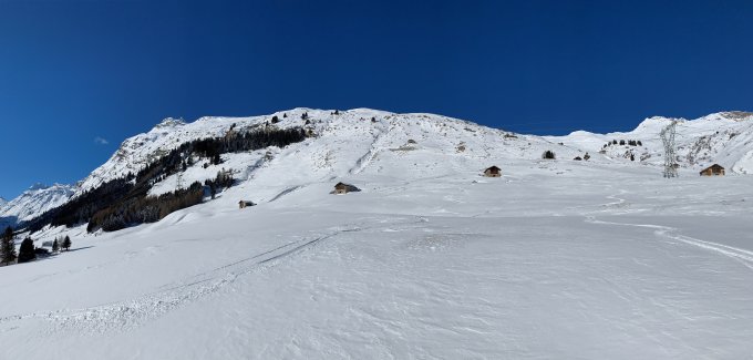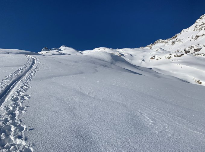 In der Aufstiegsspur bis ca. 1900 je nach Exposition zeigten sich zumteil kleine Altschnee Flecken.