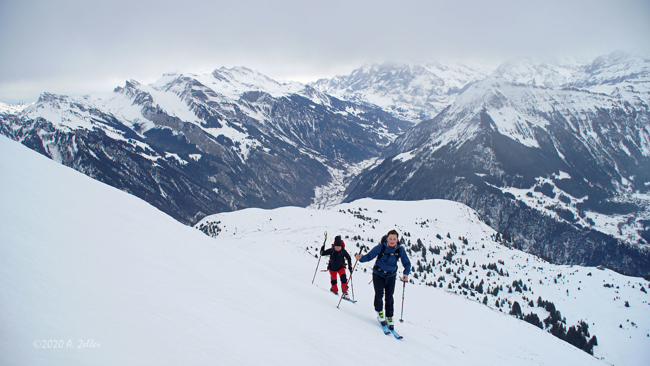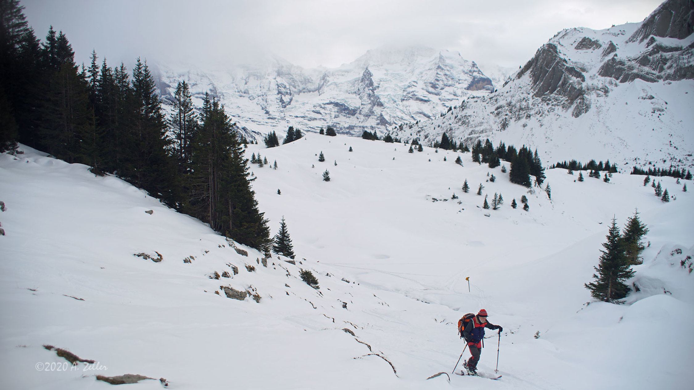 Nach Schärihuebl hinunter, dann über Chüematta nach Gumma hinunter. Kleiner Wiederaufstieg in die namenlose Lücke und über die Hänge der Mederalp nach Sulwald zurück. Schlussabfahrt auf dem Schlittelweg nach Isenfluh.