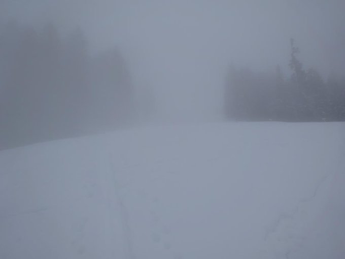 Auch in der Abfahrt zeigte sich das neue Jahr gnädig. Immer wieder weitete sich die Sicht dort, wo wir durchwollten, so dass genussvolle Schwünge ohne Instrumentenflug möglich waren. Teilweise etwas verfahren, teilweise waren noch eigene Schwünge möglich. Schöner Schnee bis ca. 1400 runter.