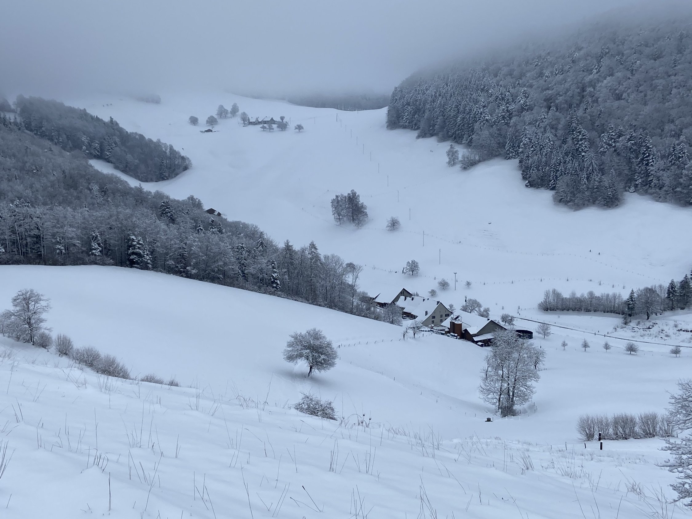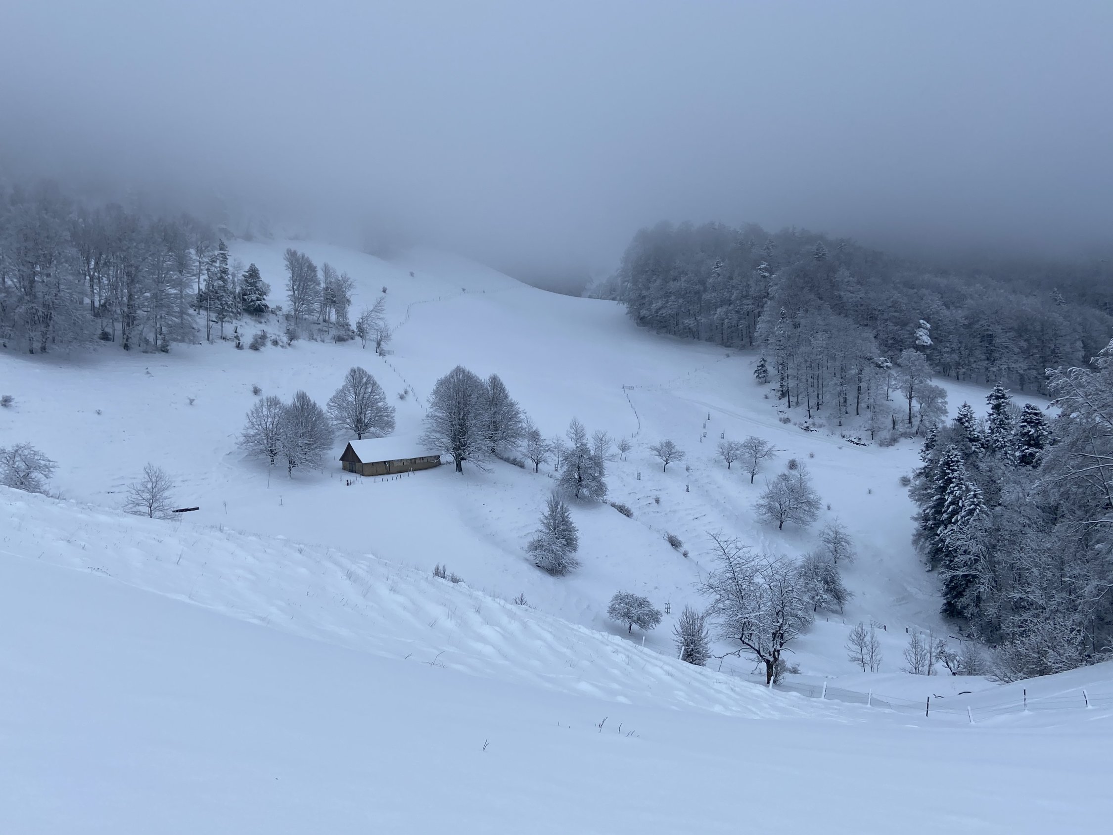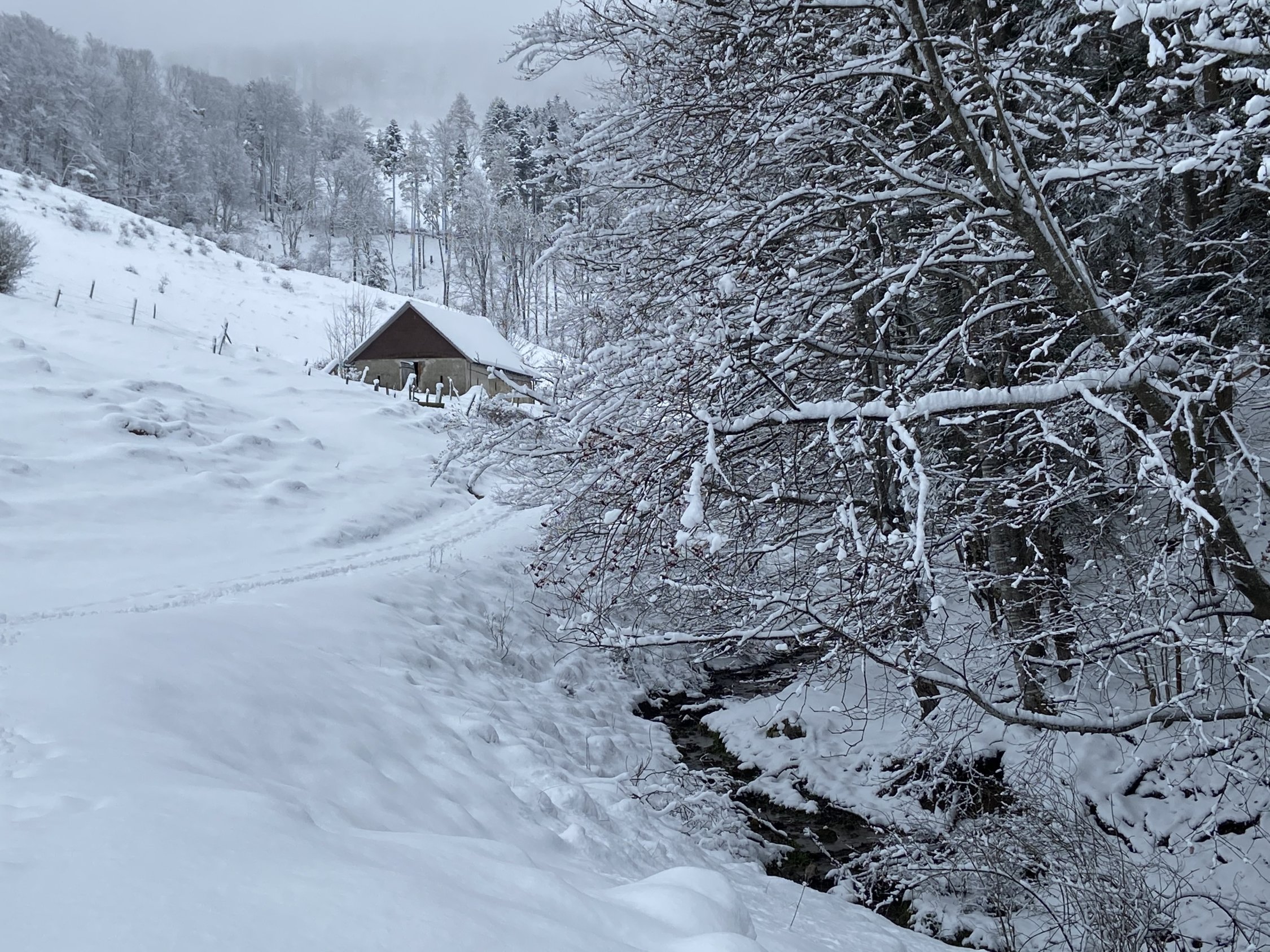 Am ehemaligen Kloster Schönthal etwa 0° C. Ab dem Humbelbach etwa 10-25 cm unverdichteter Schnee. Durch die Klus genug Schnee für Aufstieg und Abfahrt. Ab Lauch deutlich weniger Schneeauflage und Schneeverwehungen. Stark bewölkt, ab etwa 950 m in Nebel und Wolken, darunter gute Sicht
