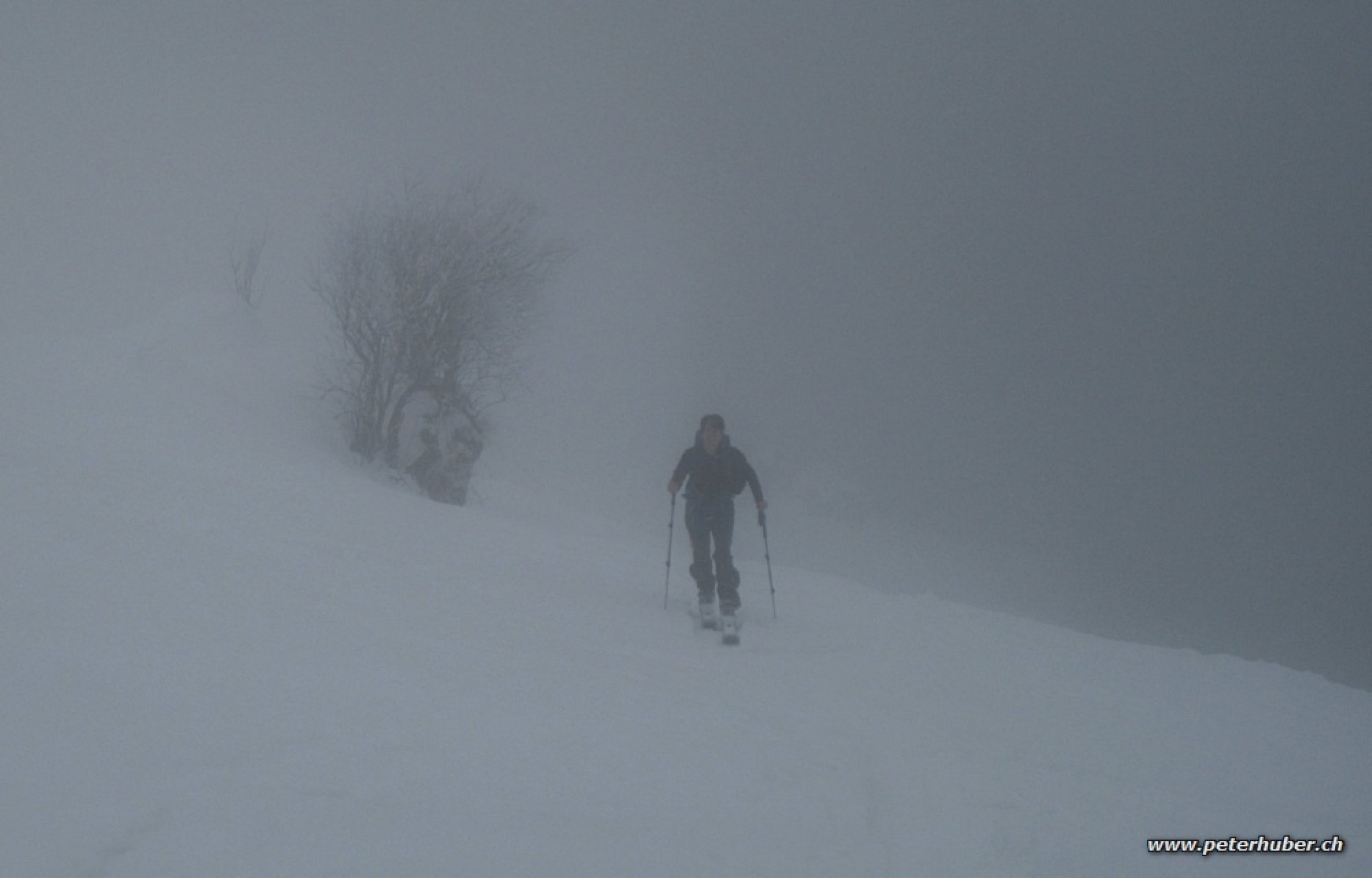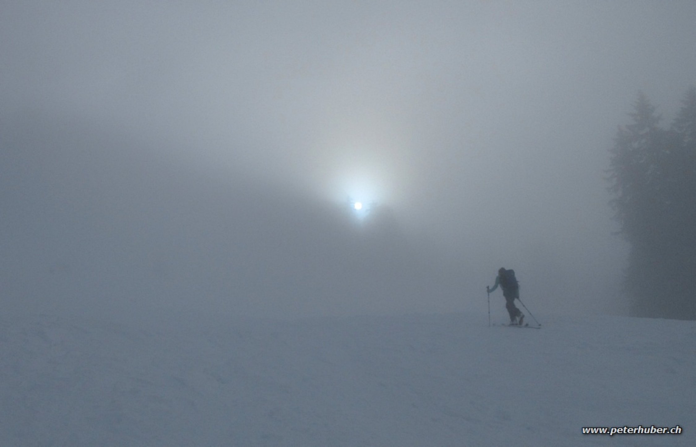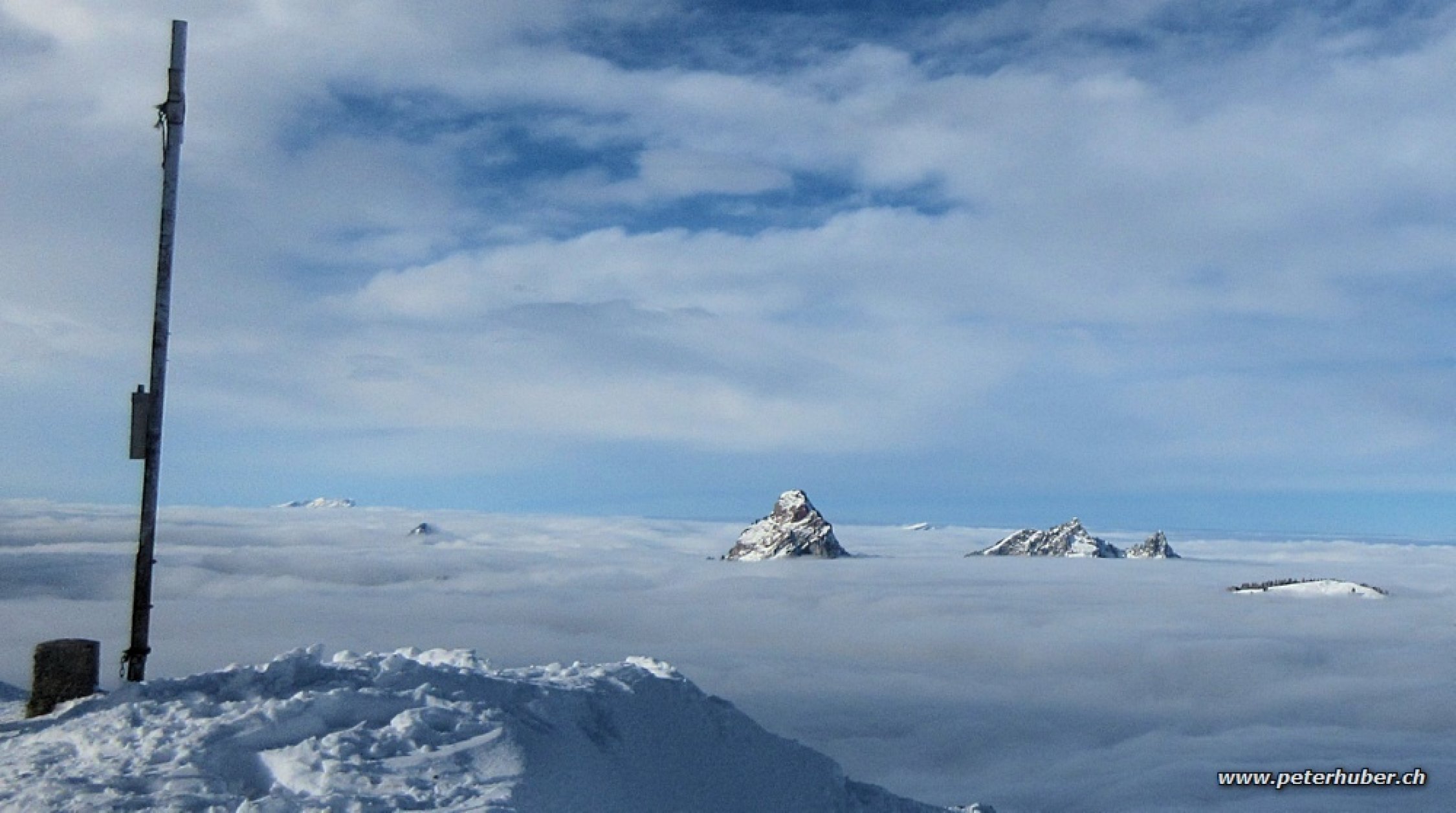 Unten bei bedecktem Himmel gestartet. Dann bei 1400 m durch dichten Nebel durch... und zum Glück kurz unter dem Gipfel aus dem Nebel gekommen. Darüber schön warm und Sonnenschein mit guter Fernsicht.