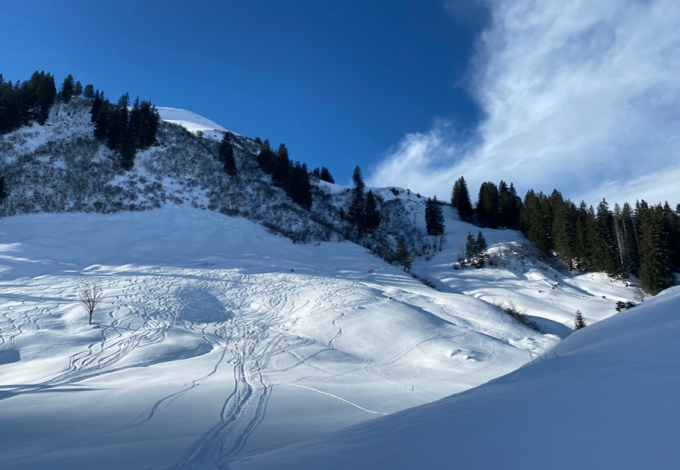 Forstweg hat aufgrund der niederen Temperaturen noch Schnee (Abfahrt an einigen wenigen Stellen dann mit Steinen !) Abfahrt im Gipfelhang Pulver und auch auf den Alphängen in der Schattseite relativ gut zu fahren. Vorsicht vor Steinen aber immer erforderlich. Insgesamt aufgrund der aktuellen Schneelage aber noch zu empfehlen.