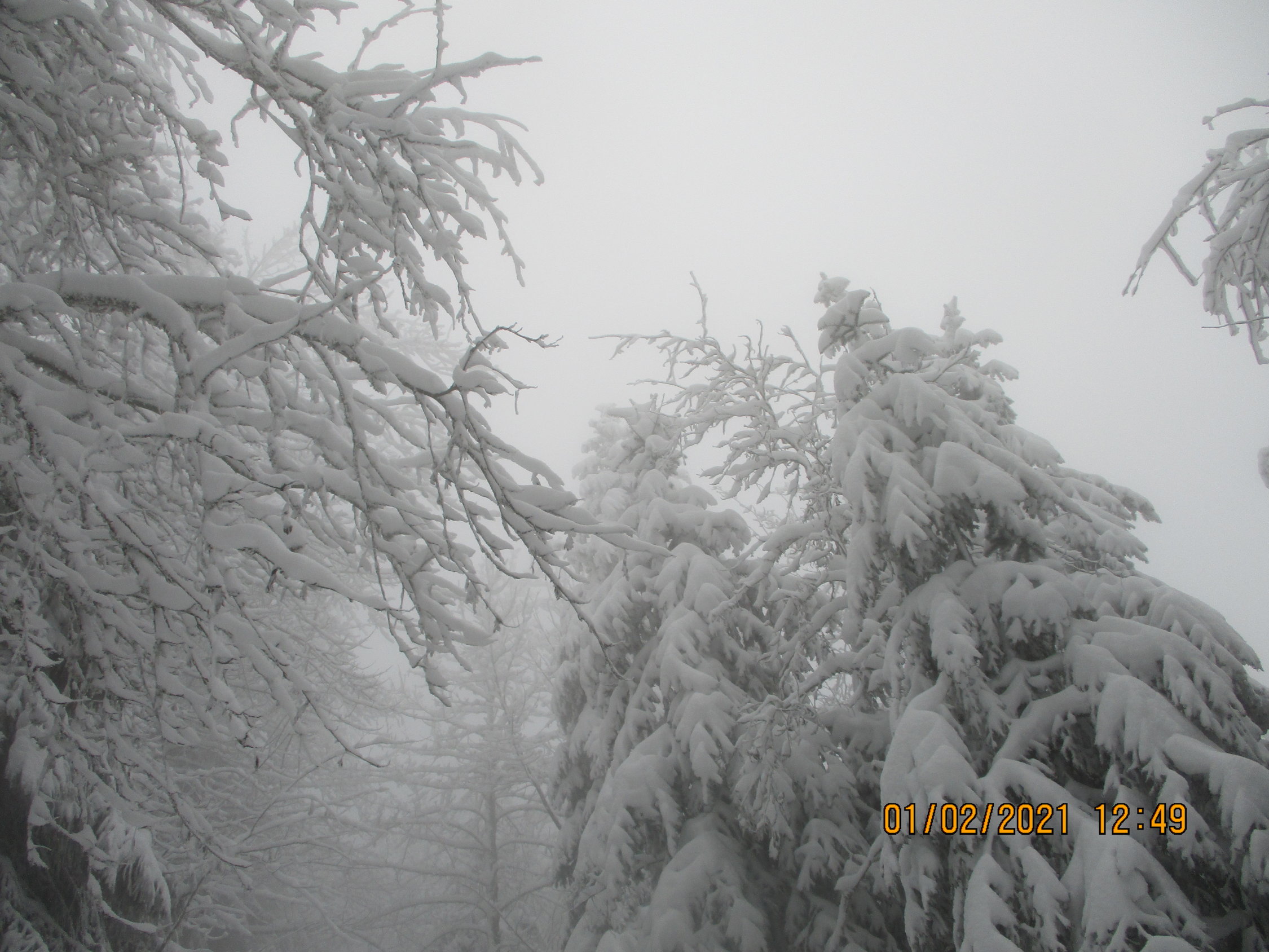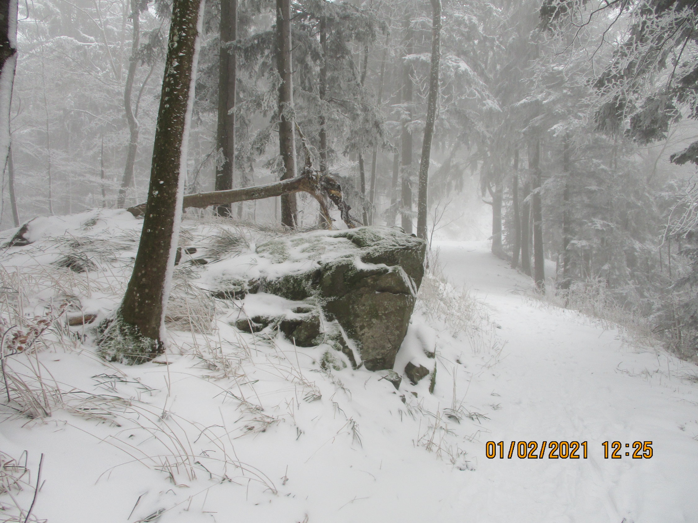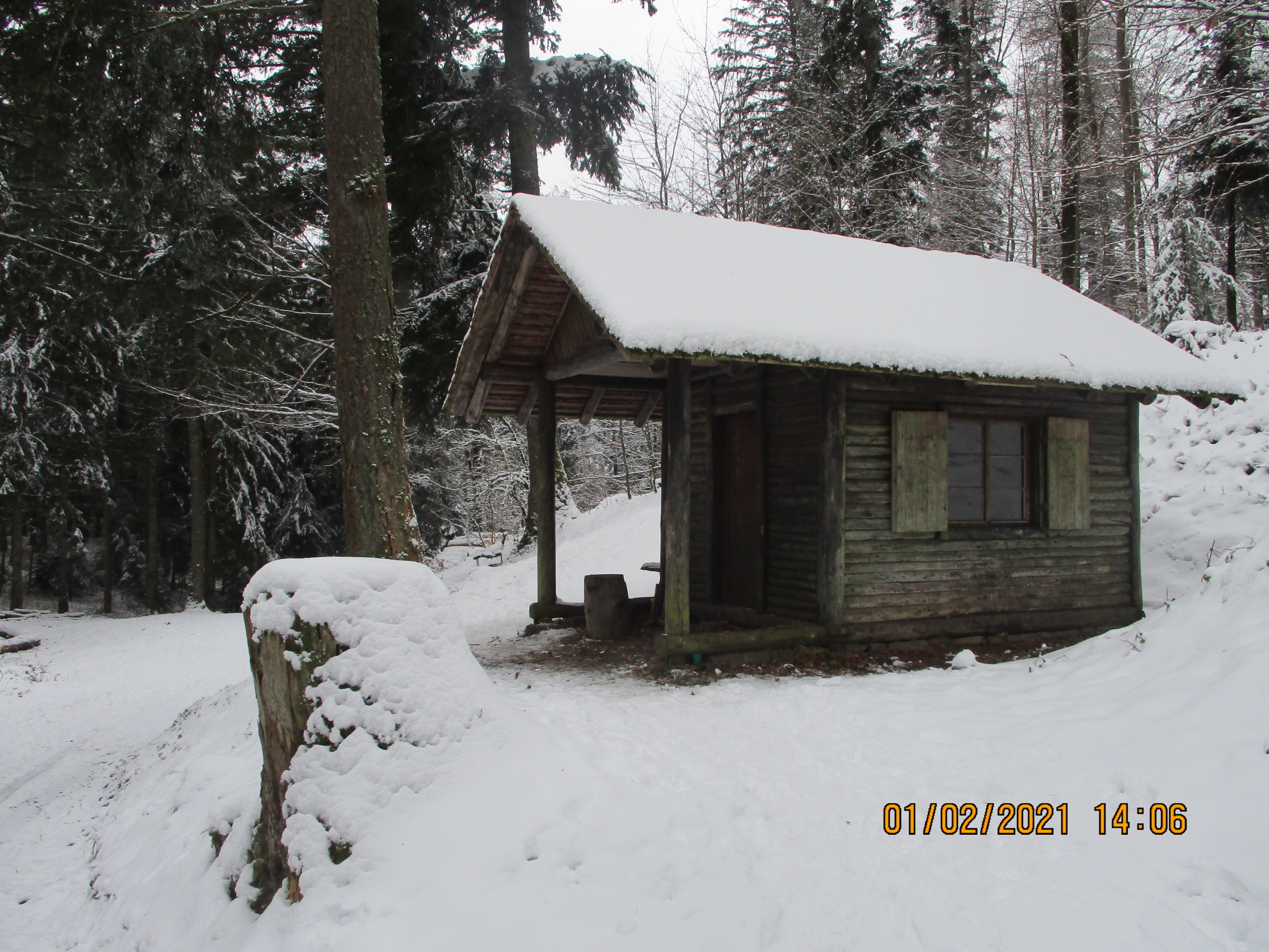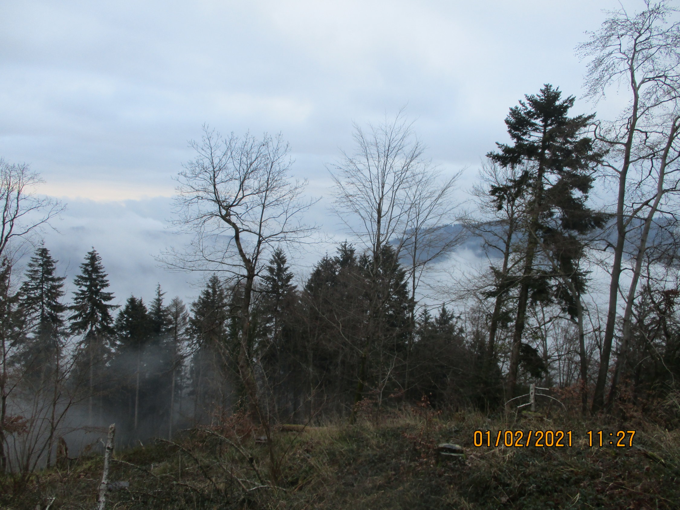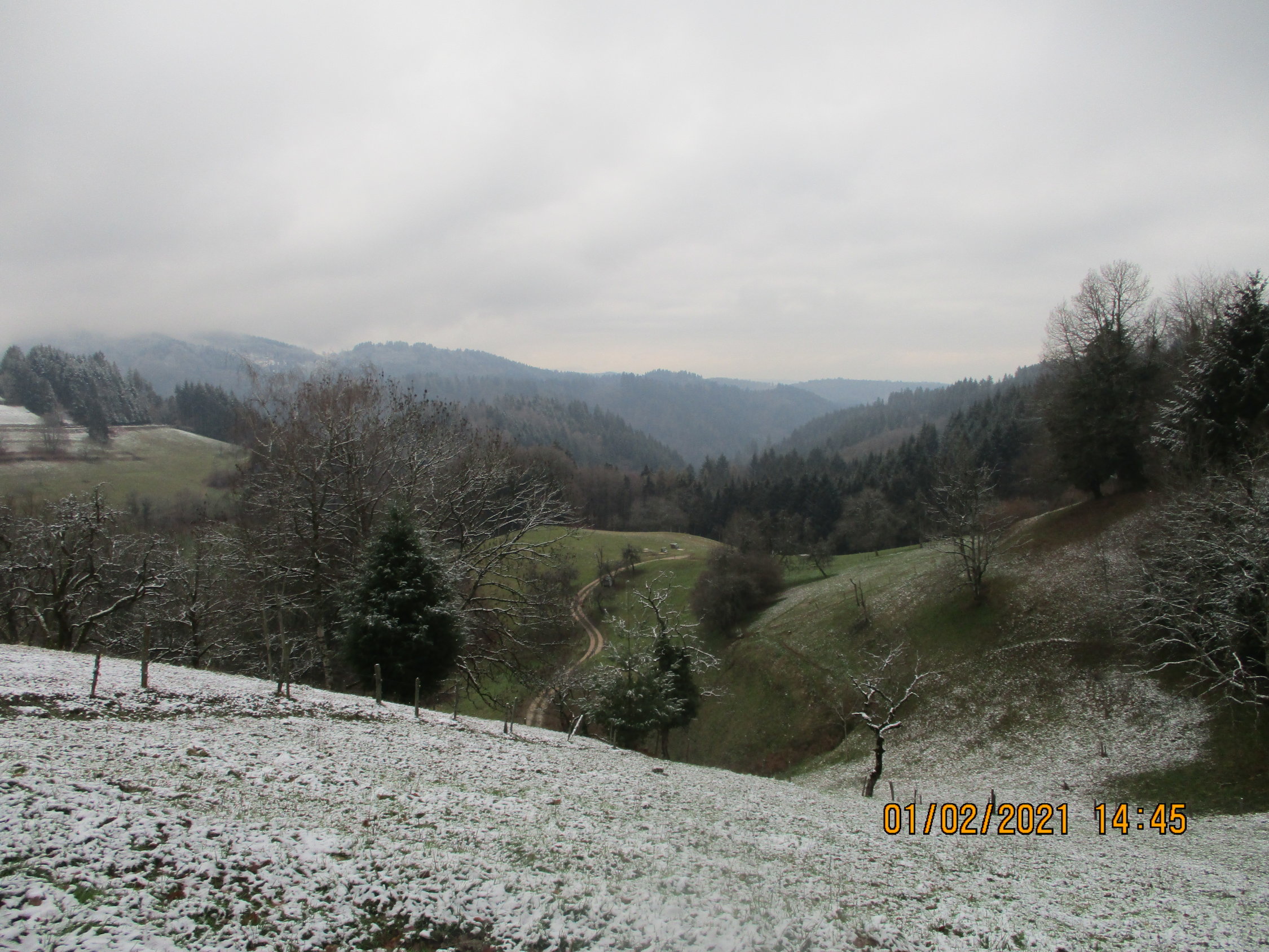 Das fast schon als mediteran geltende Mikroklima des Markgräflerlandes machte sich in der überraschend hohen Schneefallgrenze bemerkbar. Hatten wir auf unserer gestrigen Neujahrswanderung durch den Hegau bereits auf unter 600 m eine geschlossene Schneedecke, begann das erste Weiß auf 750 m, geschlossene Schneedecke dann ab 850 bis 900 m.