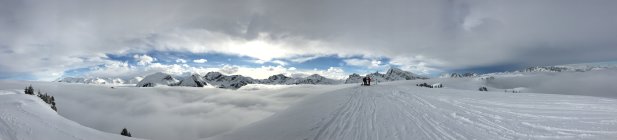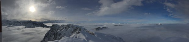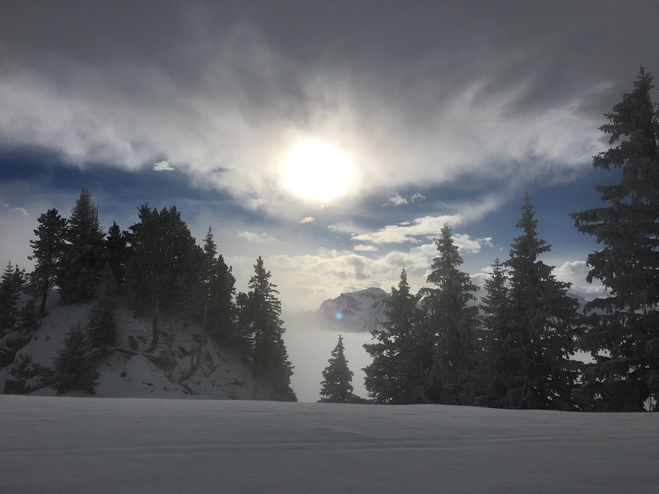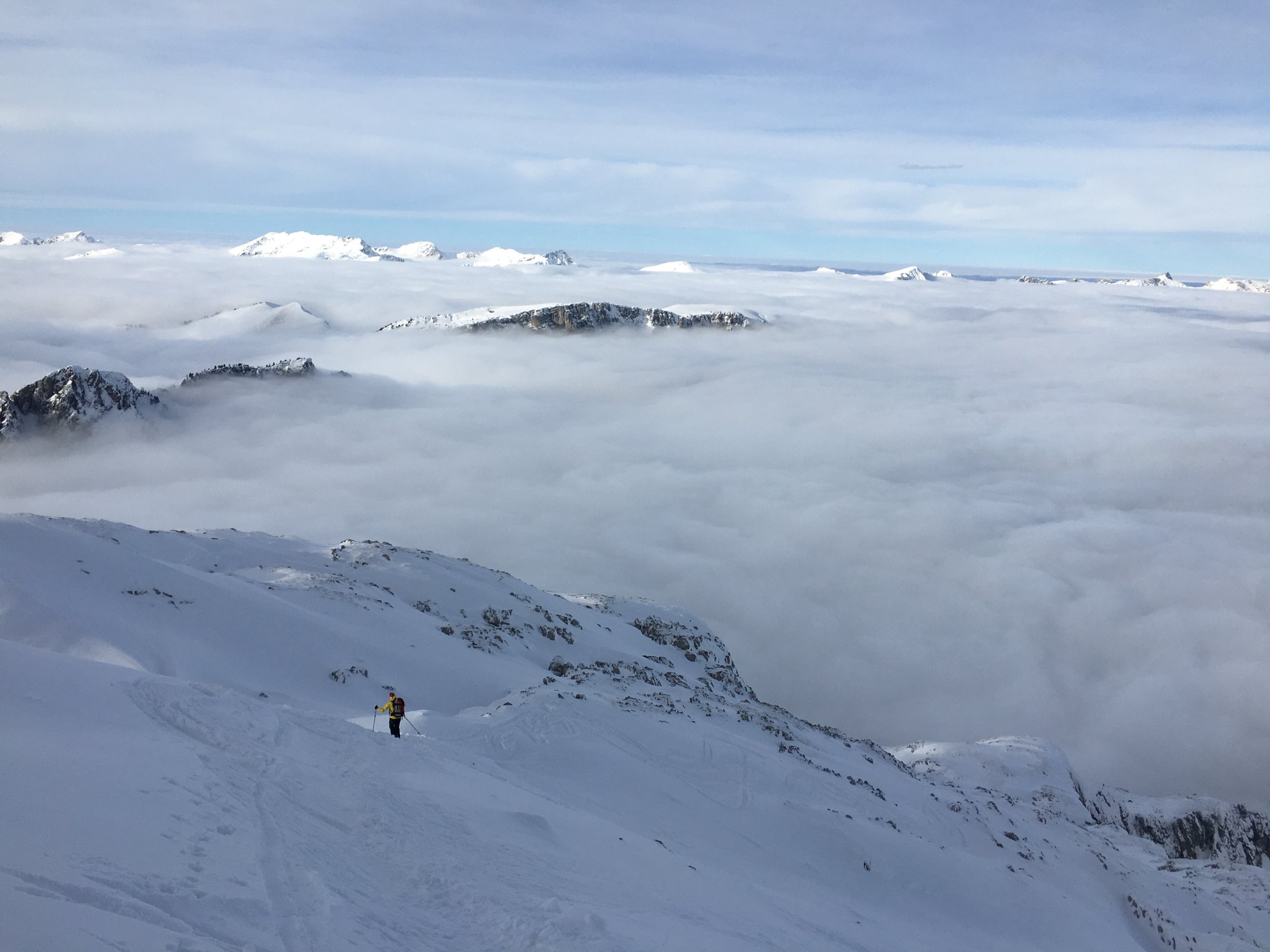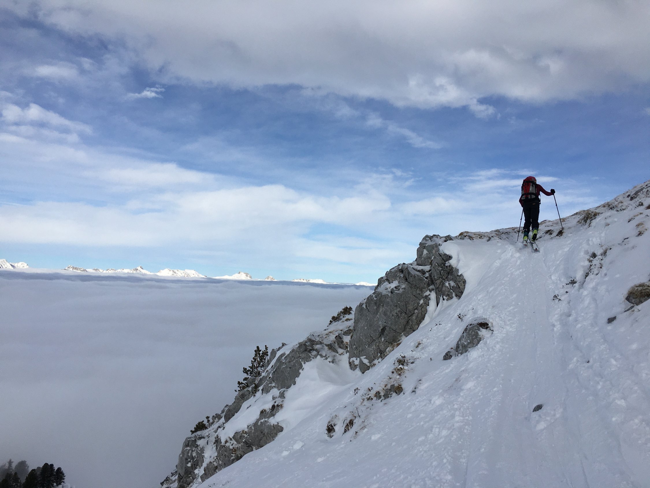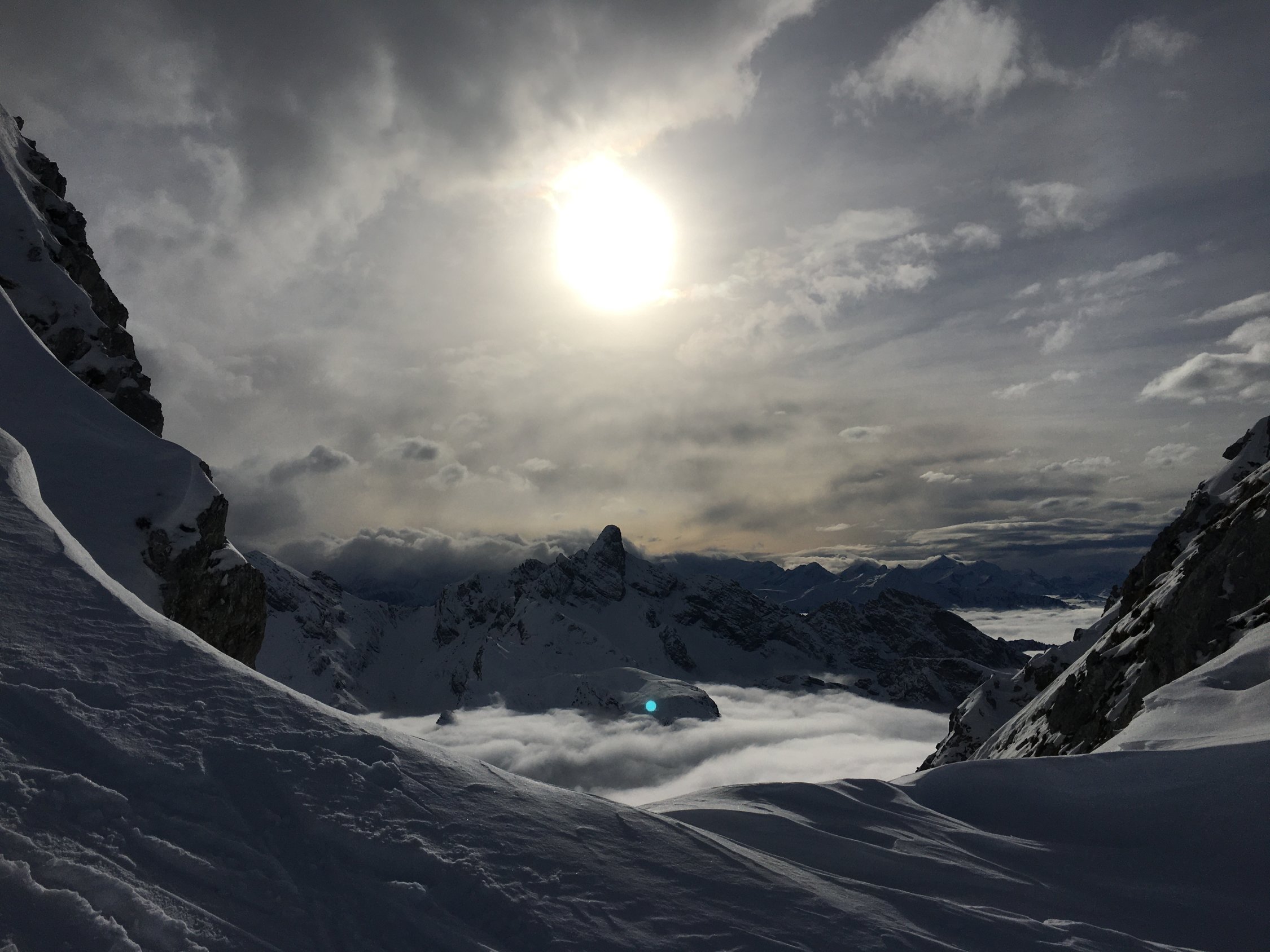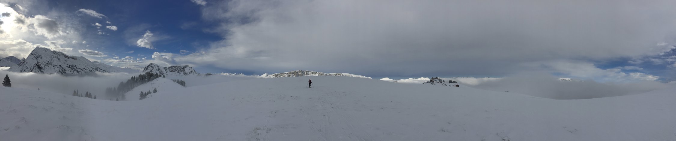 Überschreitung Meniggrat - Stand - Seehore Aufstieg ab Parkplatz Meniggrund, zunächst auf den Meniggrat in den Wolken - es hat viel weniger Schnee als in den letzten Jahren, grösstenteils "festerer Pulver". Der Meniggrat war über der Wolkendecke, es gab noch eine Hochbewölkung, die eine fantastische Stimmung erzeugte. Über Stand (1939m) zur Seehore (2282m). Es schauen noch ziemlich viele Felsen aus dem Schnee, siehe Bilder. Abfahrt war gut möglich, allerdings liess sich ab und zu Steinkontakt nicht vermeiden. Gegenaufstieg zum Stand und Abfahrt in den Meniggrund.