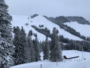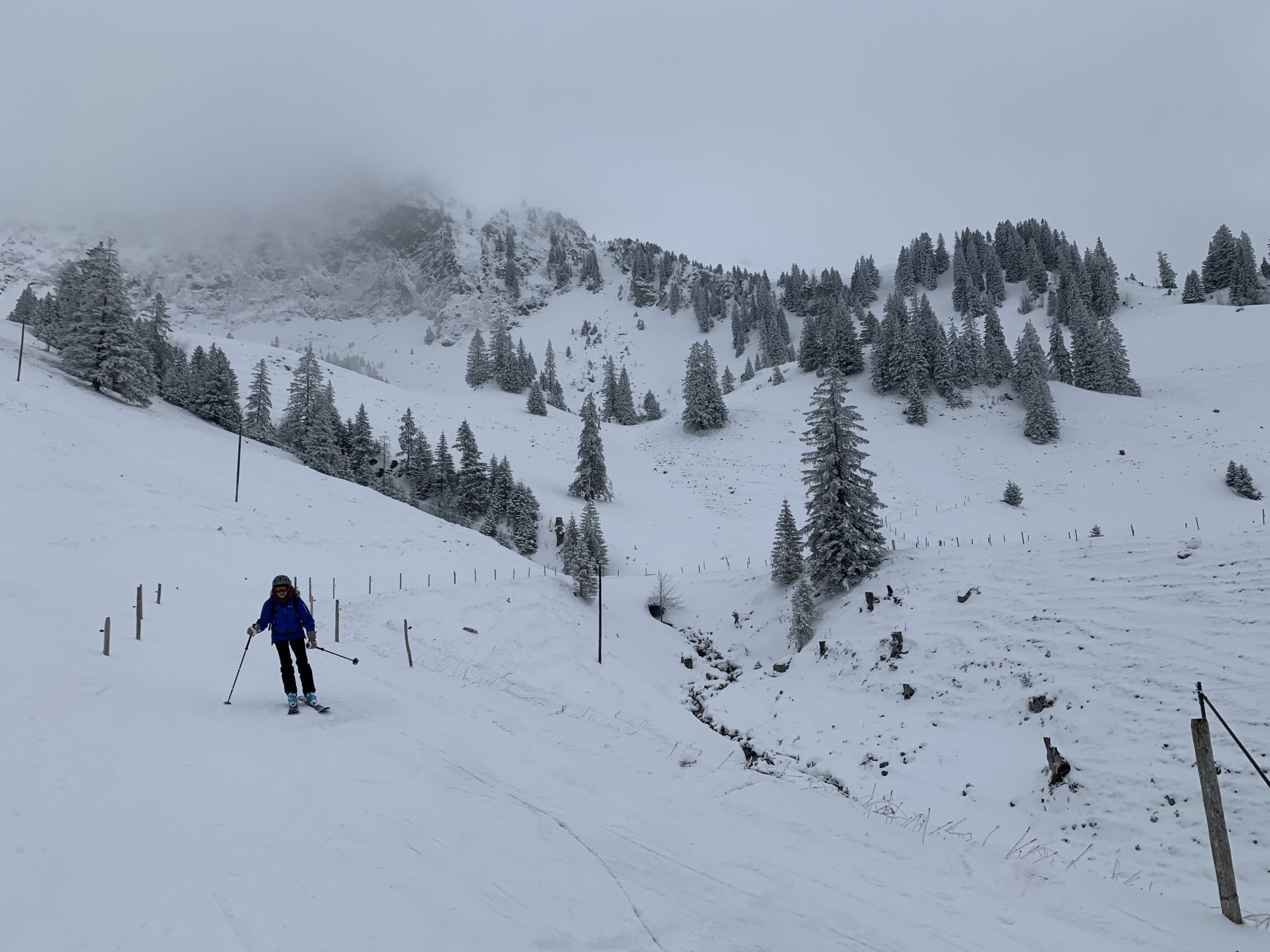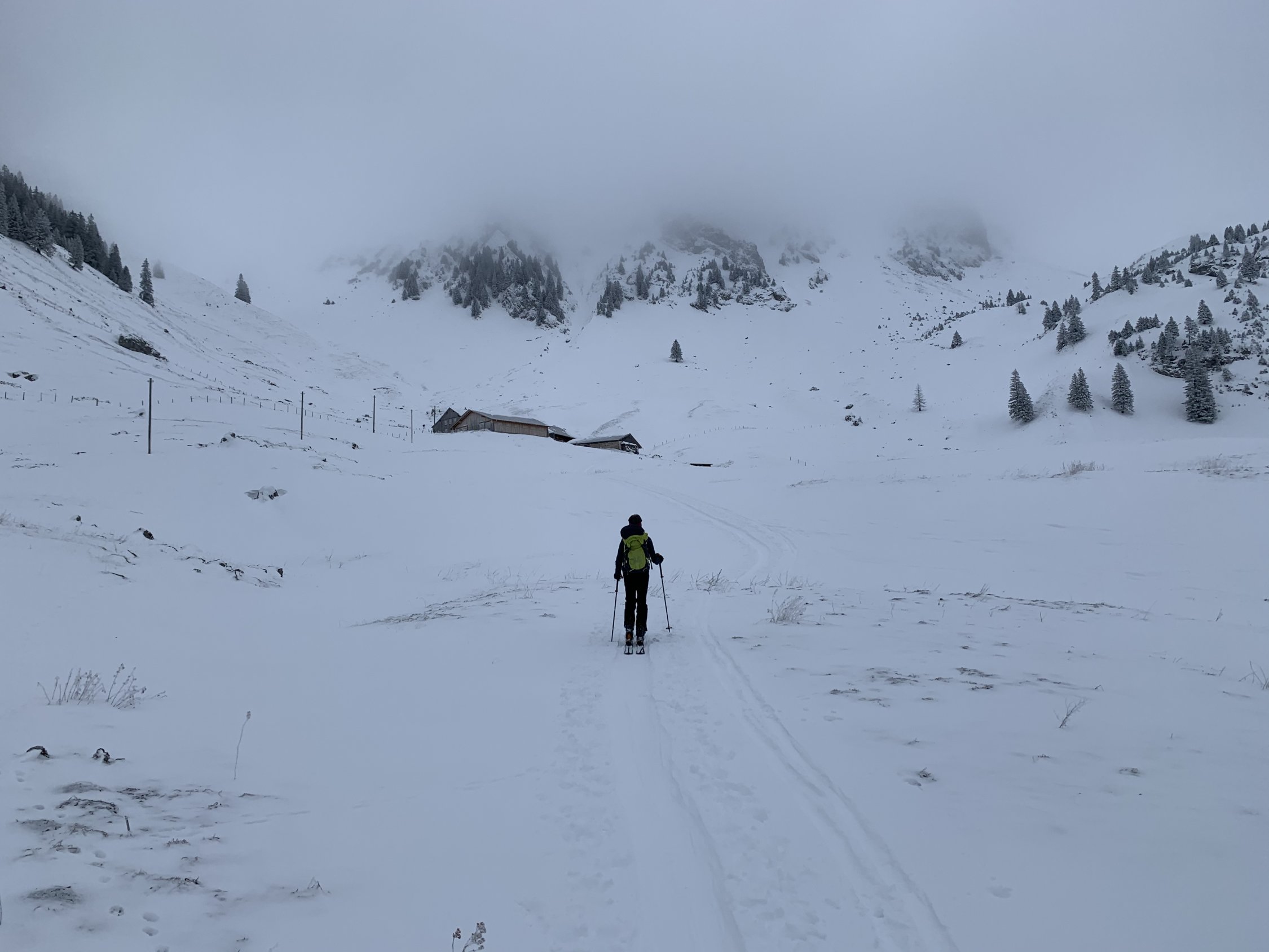 Eher wenig Schnee, Abfahrt vom Frilismad von oben gesehen links haltend, dann zum Schluss besser auf Alpstrasse.