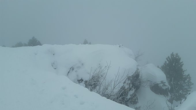 Gut eingeschneit und sehr ausgeprägte Spur(en) für den Aufstieg. Heute wie vorhergesagt Nebel von unten bis oben, dafür recht wenig los.