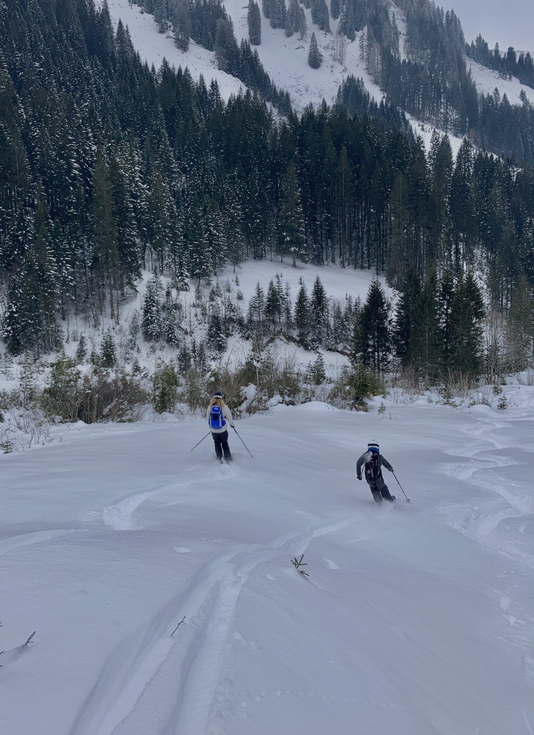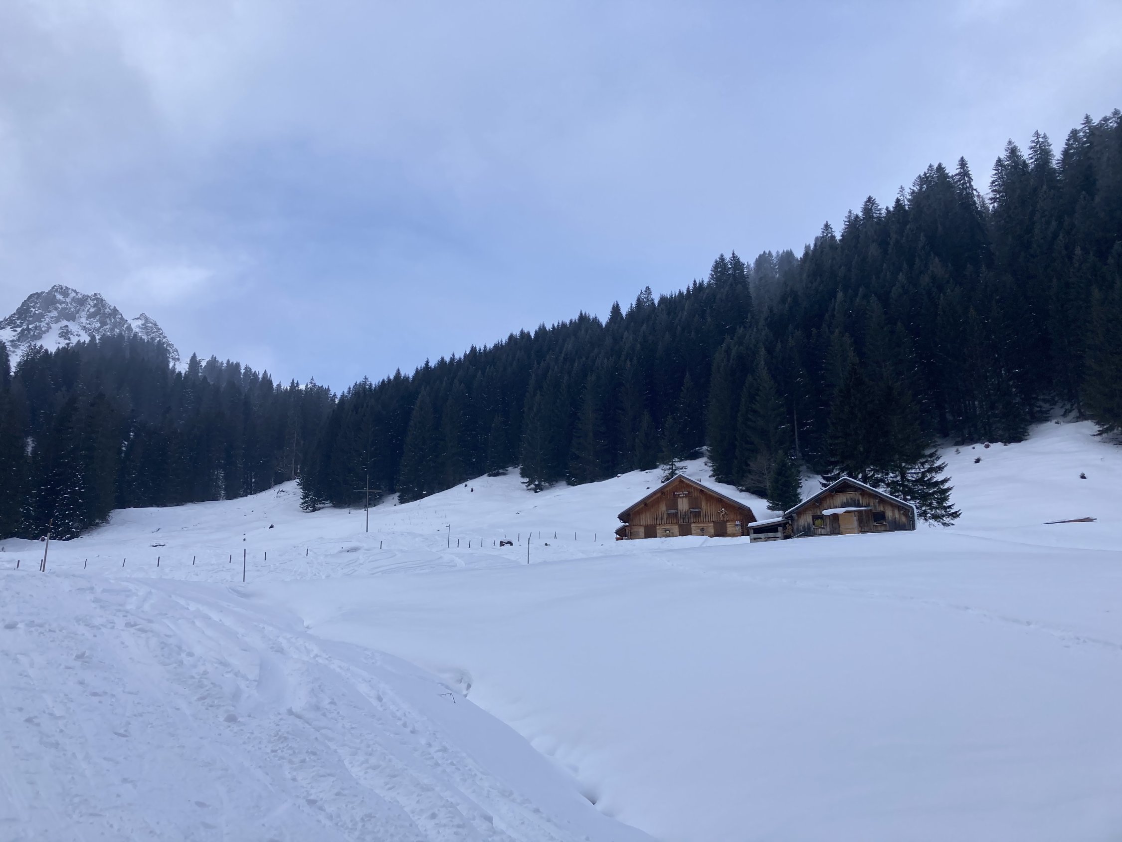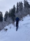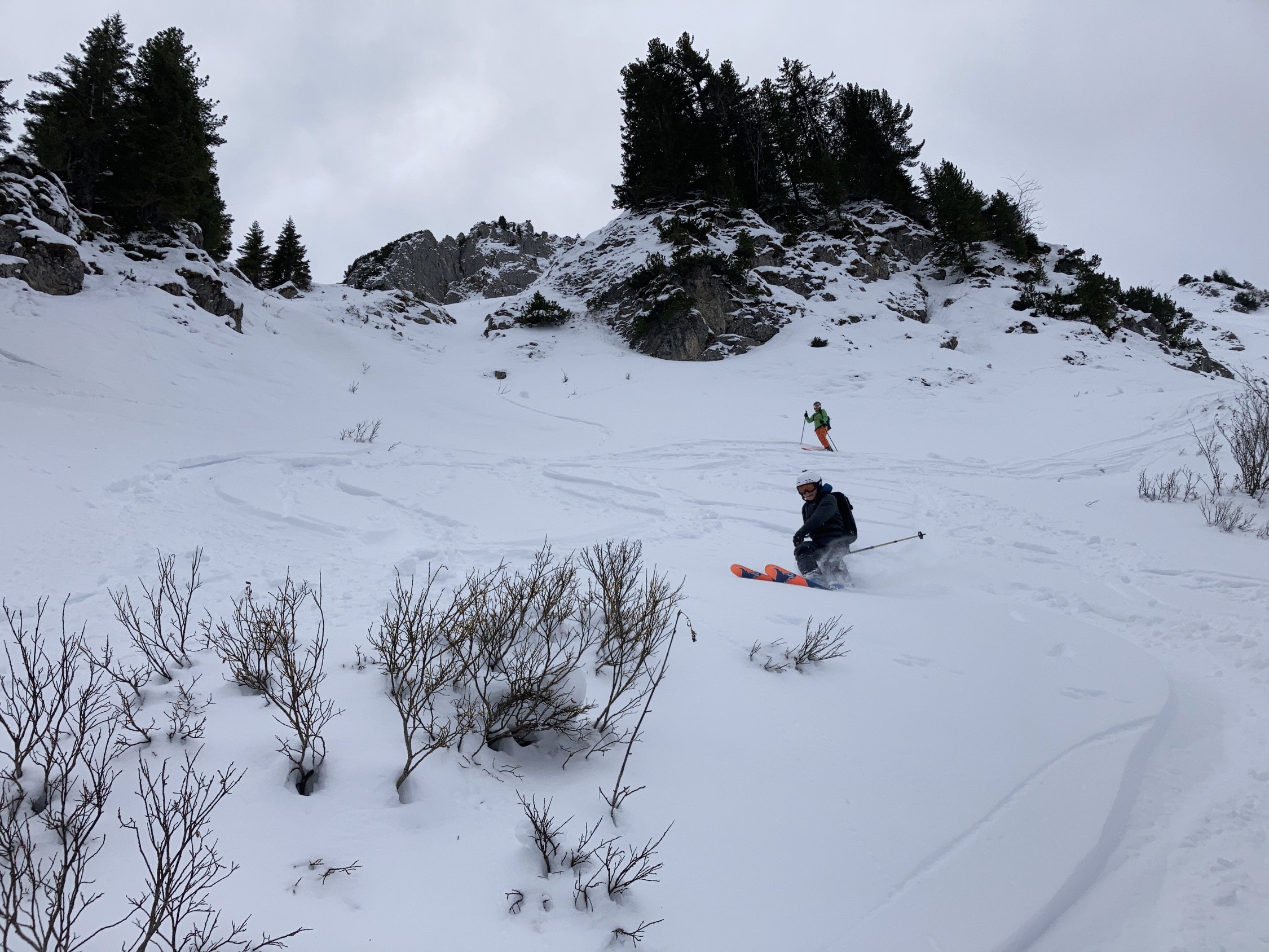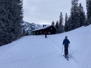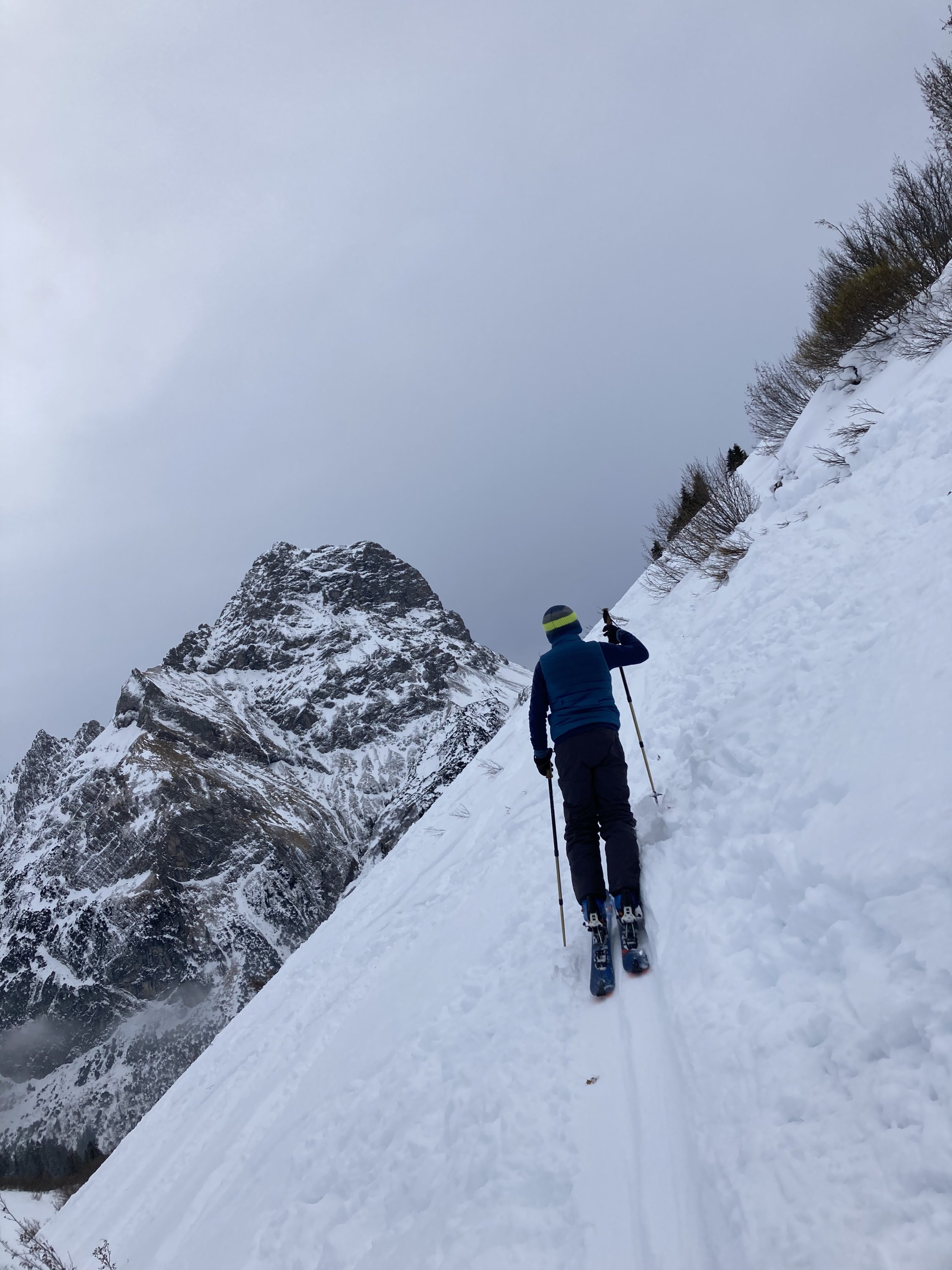 Die Bedingungen sind gar nicht so schlecht. Natürlich derzeit überall noch zu wenig Schnee, aber das ist ja allgemein bekannt. Gamsfuss aber erstaunlich gut machbar. Start am gebührenpflichtigen Parkplatz in Bad (Tag 6,-). Weg zur Bärgunthütte sehr gut. Lediglich in der bewaldeten Steilstufe oberhalb der Bärgunthütte ist es schneetechnisch etwas mager. Danach aber wieder sehr gut bis zum Gipfel zu gehen. Steilstufe oben ebenfalls problemlos machbar. Schneequalität sehr gut und immer noch schöner Pulverschnee. Abfahrt gut und verschiedene Möglichkeiten eingefahren. Wir sind um die Älpelespitze in Richtung Höferspitze herumgequert und dort abgefahren. Lediglich mal kurz für etwa 40m durch die Büsche kämpfen, aber ansonsten schön zu fahren.