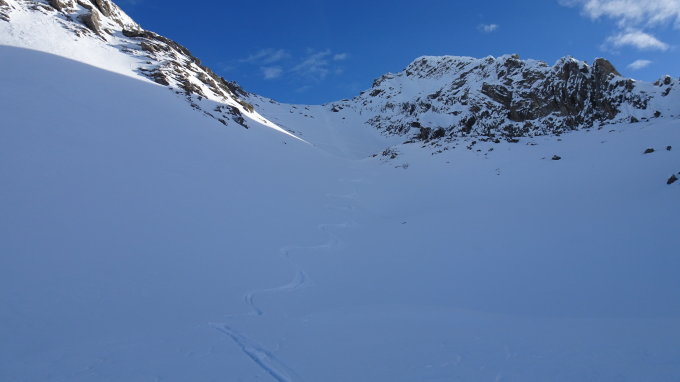 Überall Pulverschnee sehr unterschiedlich von 5-30cm aber gut gesetzt deshalb auch kein Problem für die steilen Aufstiege in den Coulis
