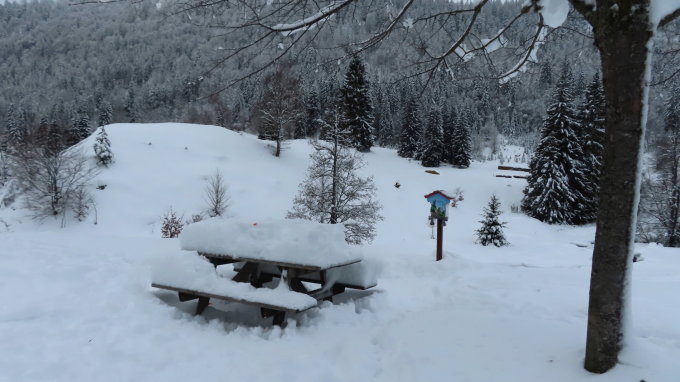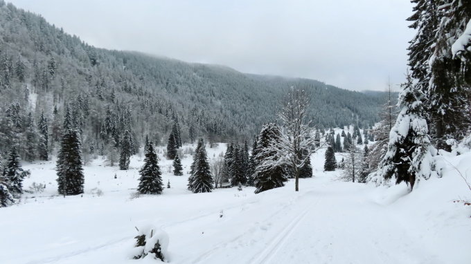 Die Obergrenze der Hochnebeldecke lag etwa bei 1430 m, also am Gipfel wenig über uns. Tiefwinterlicher Verhältnisse mit sehr guter Schneelage bis ca. 60 cm auf der ganzen Route. Temperatur im Minusbereich. Pulverschnee. Dichter Nebel zwischen 1200 und 1350 m.