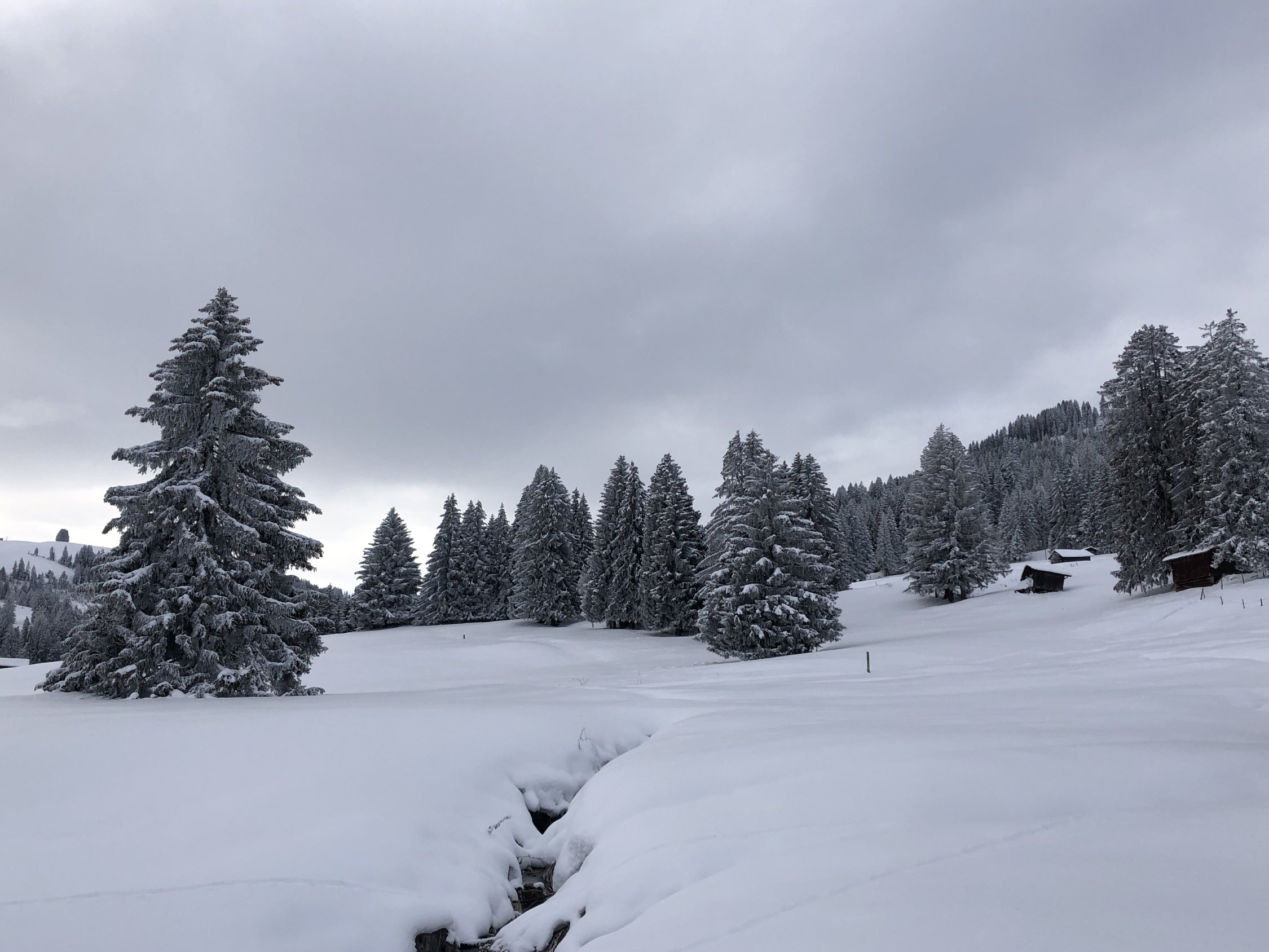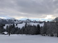 Abfahrt vom Hundsrügg über Ostflanke topp. Das flache Gelände bis zur Alp Site kann über die Winterwanderwege des Sparenmoos überwunden werden. Die folgenden Hänge bis Zimmerböden könnten nicht besser sein, schön leichter Pulver. Da man sich an schattiger Lage und auf Heuwiesen bewegt, ist auch der untere Teil trotz fehlender Unterlage toll zu fahren.