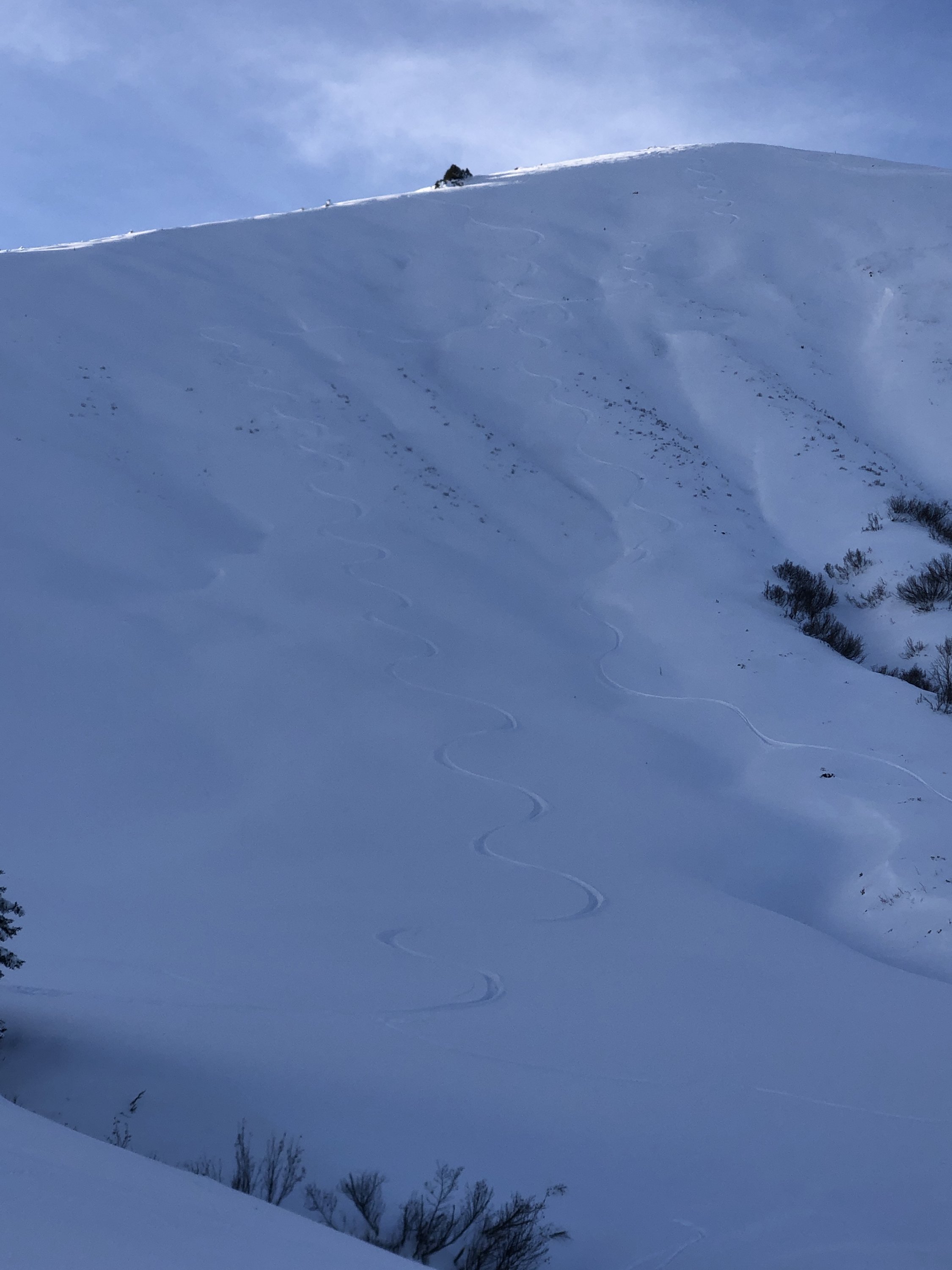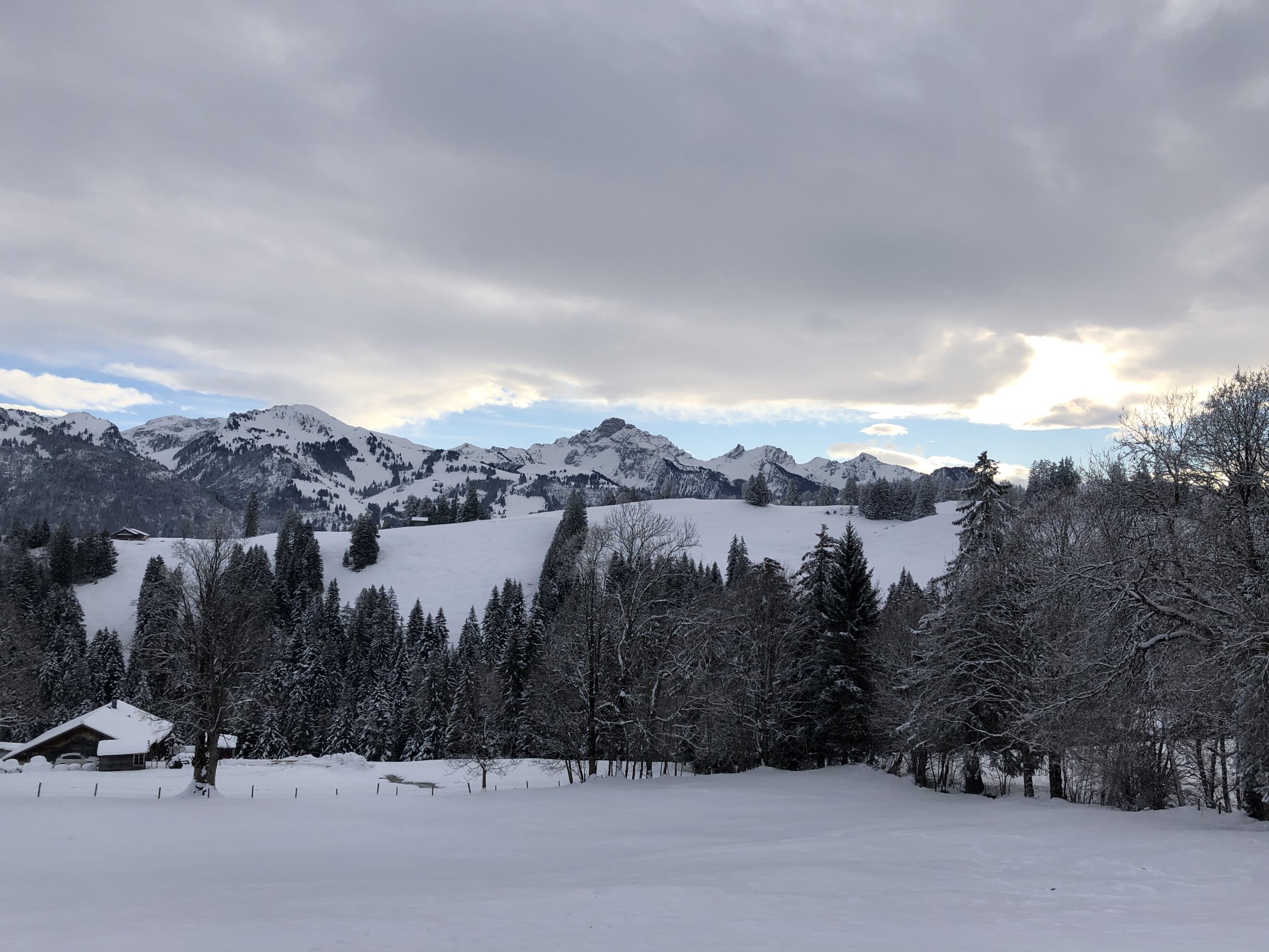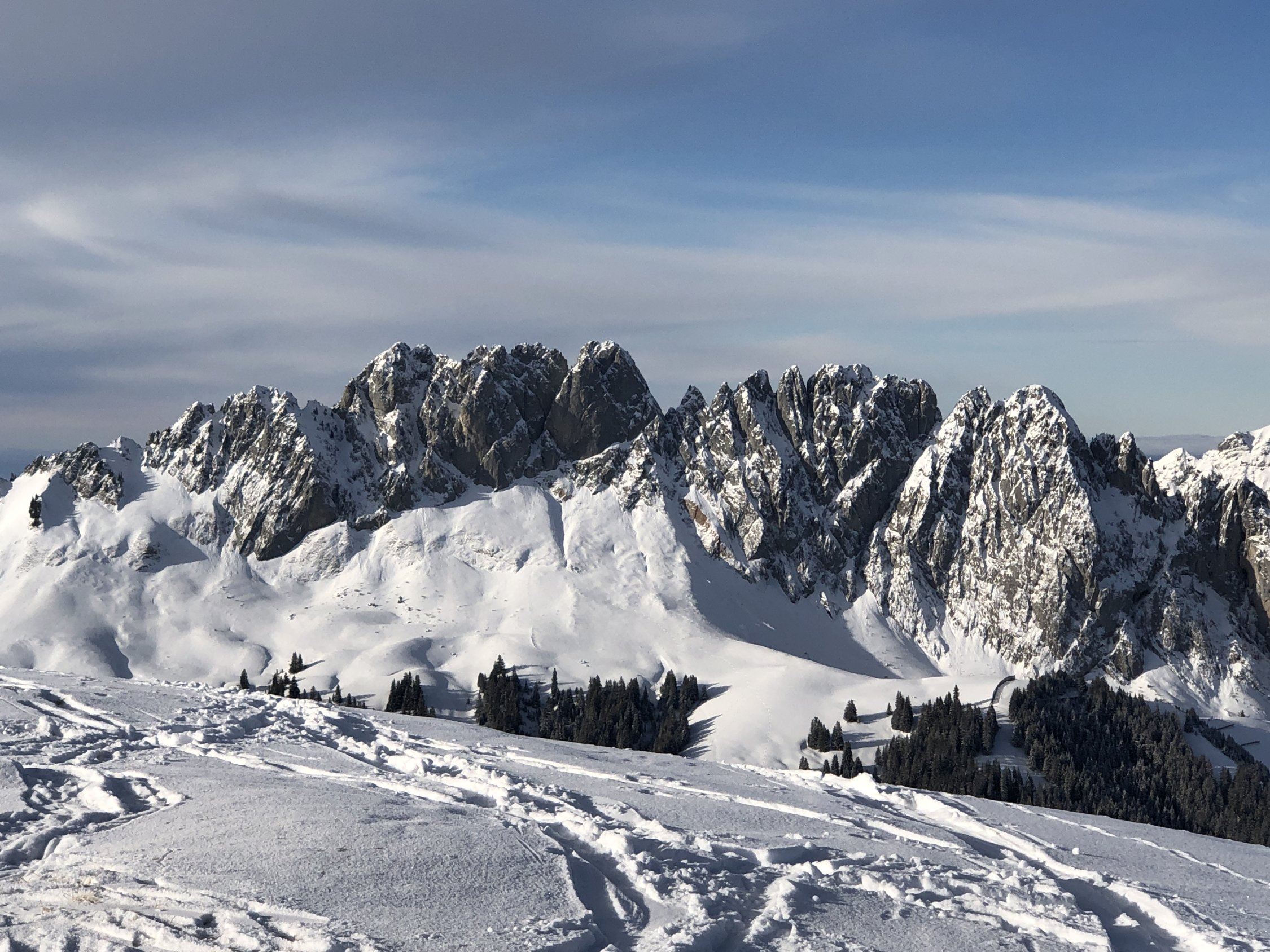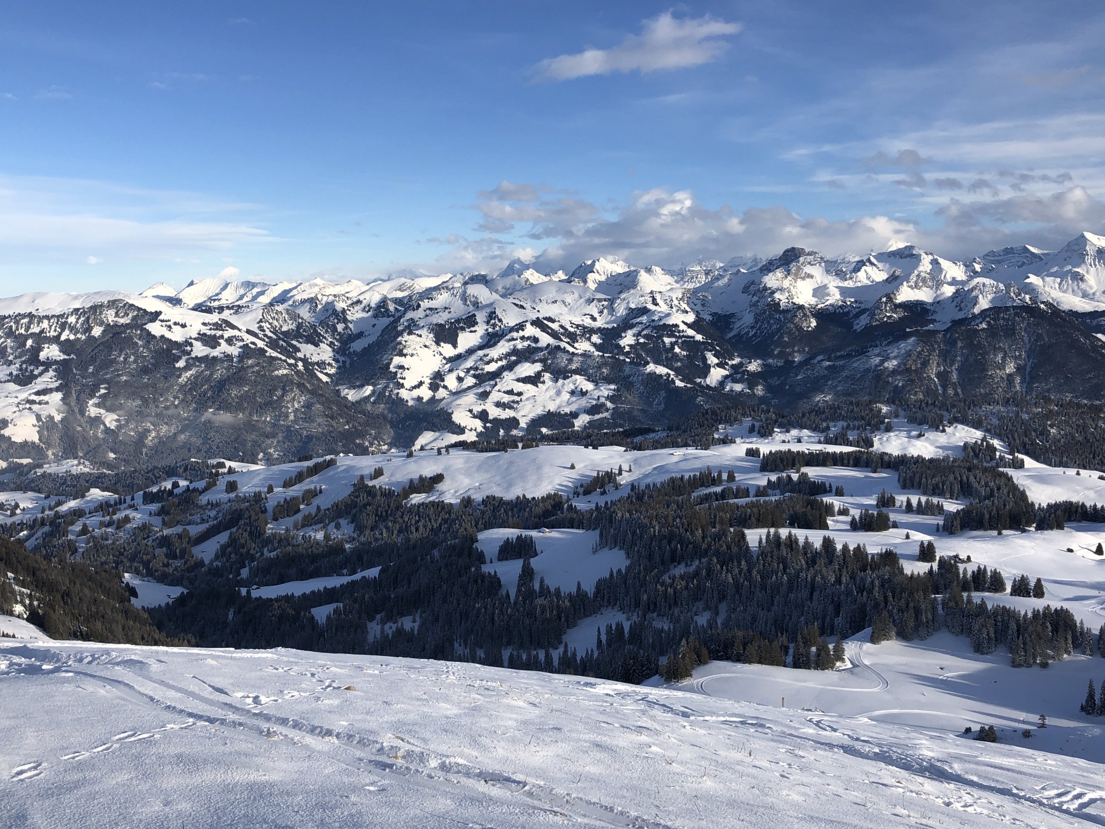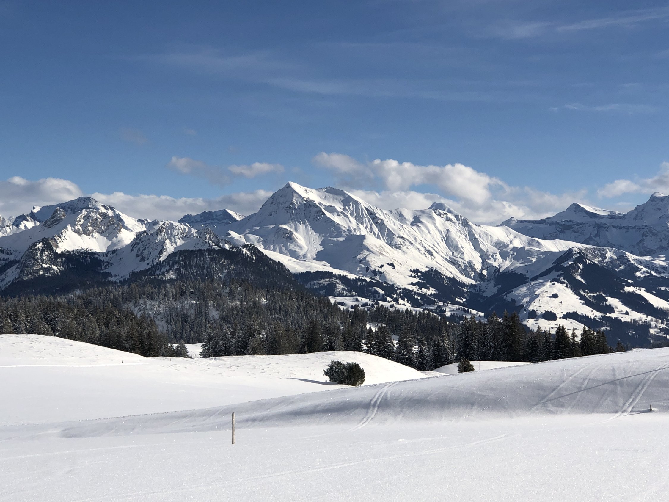 Die Abfahrt vom Mattenhubel wird vom Jaunpass her frequentiert, da aber das Gelände etwas unübersichtlich ist und alle den gleichen Korridor befahren, gibt es auch freie Hänge. Dem sonnigsten Abschnitt oberhalb Waldweid fehlt die Unterlage, war mit umsichtiger Fahrweise aber immer noch prima.