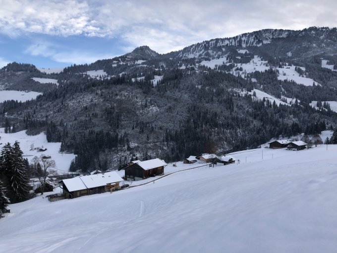 Die Abfahrt vom Mattenhubel wird vom Jaunpass her frequentiert, da aber das Gelände etwas unübersichtlich ist und alle den gleichen Korridor befahren, gibt es auch freie Hänge. Dem sonnigsten Abschnitt oberhalb Waldweid fehlt die Unterlage, war mit umsichtiger Fahrweise aber immer noch prima.