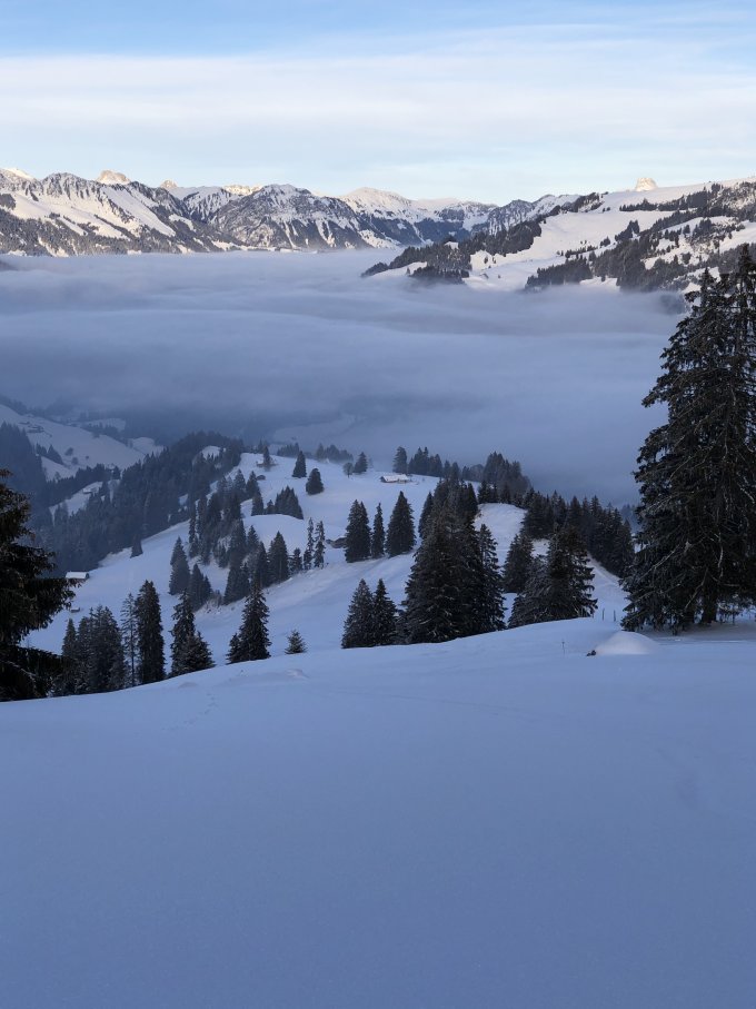Abfahrt vom Hundsrügg über Ostflanke topp. Das flache Gelände bis zur Alp Site kann über die Winterwanderwege des Sparenmoos überwunden werden. Die folgenden Hänge bis Zimmerböden könnten nicht besser sein, schön leichter Pulver. Da man sich an schattiger Lage und auf Heuwiesen bewegt, ist auch der untere Teil trotz fehlender Unterlage toll zu fahren.