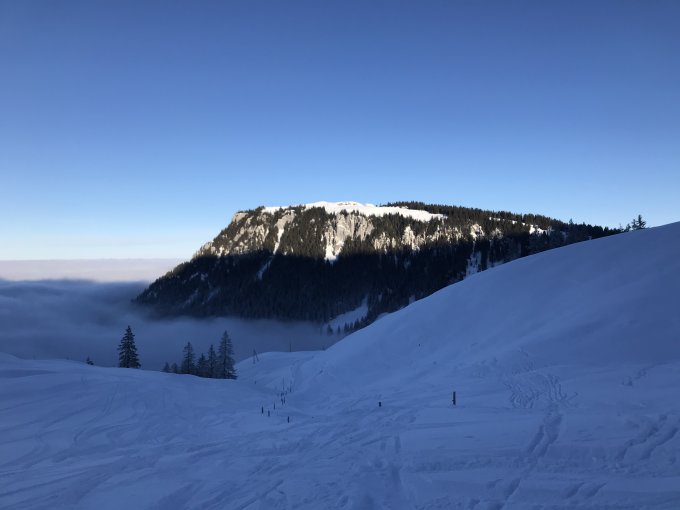 Nebelgrenze zwischen 1400-1650m, darüber Sonne pur. Gut gespurt keine Harscheisen nötig. Im unteren Teil eine leichte Kruste, aber immer noch gut fahrbar. Ganze Route schon ziemlich verfahren aber da es viele Möglichkeiten gibt, sind noch eigene Linien möglich.