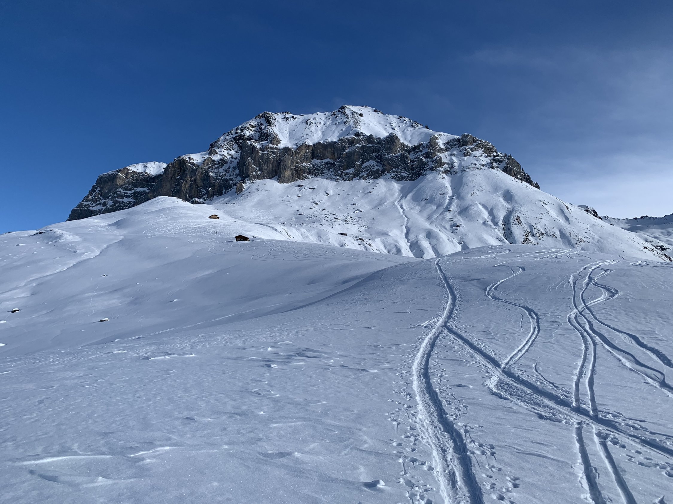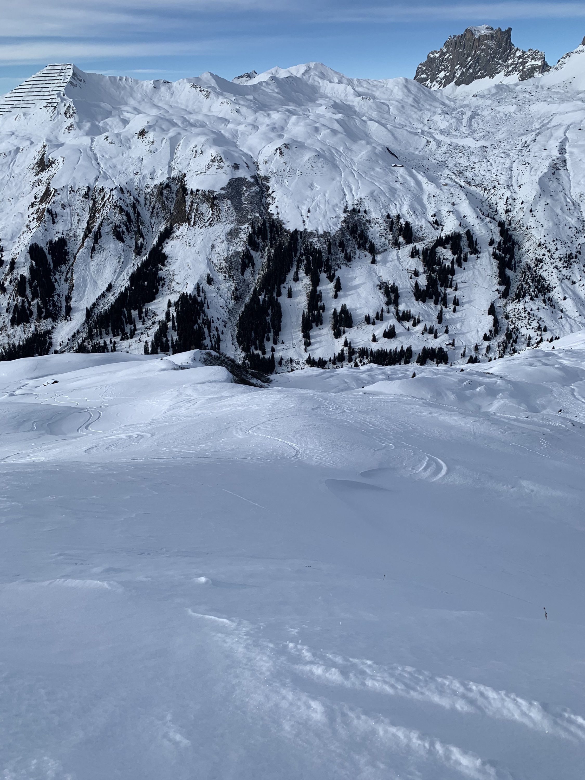 Auch südseitig Pulverschnee. Wir nahmen die NordWest Abfahrt (126c). Die ersten 400hm super Pulver ohne fremdspuren. Danach 5-8cm Pulver auf hartem Untergrund. Es hat noch genügend Platz für eigene Spuren. Schön wäre es wenn nun Neuschnee kommt. Unterhalb 2000m wird es knapp.