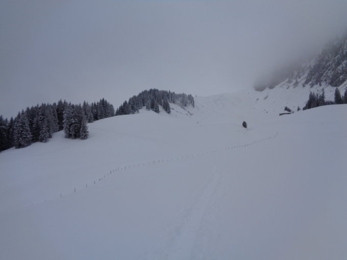 Abfahrt: Einzig die Fangweide erforderte infolge Schneeknappheit ein vorsichtiges abfahren. Die Waldschneisen und Wind geschützten Partien boten wunderbaren Pulverschnee.