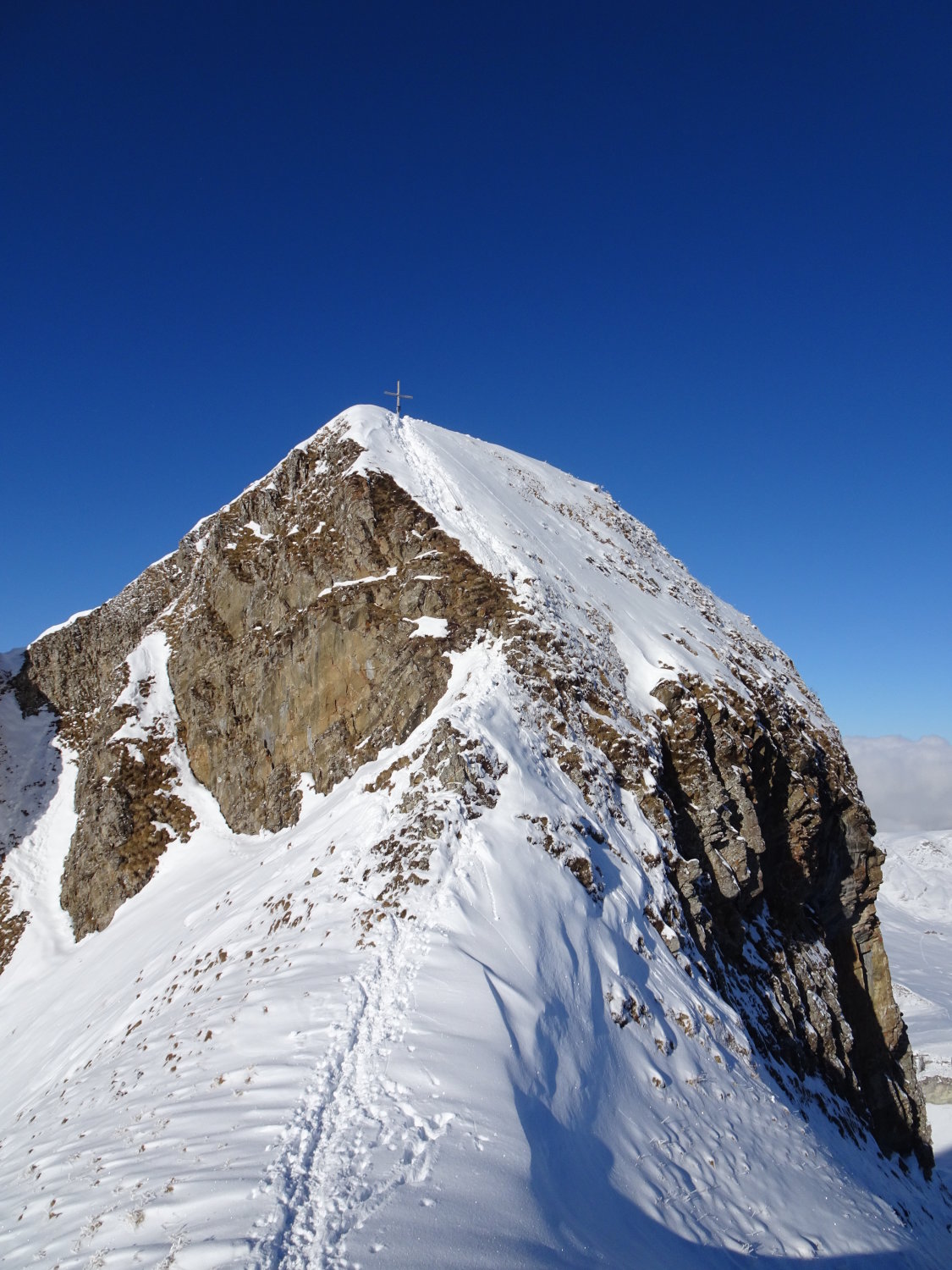 Der Aufstieg zum Gipfelkreuz geht gut und das Fixseil ist frei.