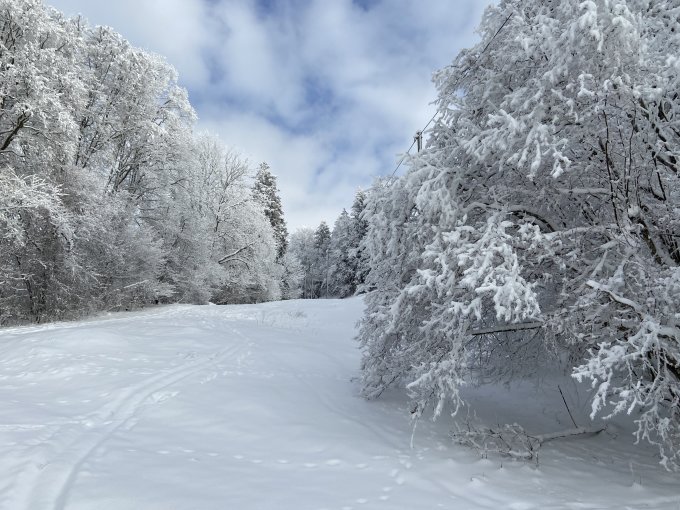Sehr verwunderlich, dass man diesem Berg bislang im Gipfelbuch keine Beachtung geschenkt hat. Um Missverständnissen vorzubeugen: es handelt sich um die Geissflue nördlich des Chilchzimmersattels. Es hat ja noch einige andere Geissflues im Jura. Scheint ein beliebter Name für einen Gipfel zu sein. Keine publizierte Route im gipfelbuch.ch ersichtlich, also erhält er hiermit endlich den verdienten Eingang ins Tourenportal mit einer Skiroute. Es ist somit die dritte Skiroute von Schönthal/Langenbruck auf einen der umliegenden Gipfel. Spuranlage im Bereich Hof Kehr aufgrund der Geländestrukturen eher flach mit zwei sehr kurzen Anstiegen auf dem Rückweg, die mit angeschnallten Skiern jedoch gut bewältigt werden können (keine Felle notwendig). Eine steilere Spur ab Kehr auf dem Hinweg macht leider keinen Sinn, da die Haarnadelkurve unterhalb des Chilchzimmersattels auf jeden Fall anvisiert werden muss, als letzte Möglichkeit den Gegenhang zu erreichen. Auch wenn es beim Start unmöglich scheint: das stellenweise sehr schmale Band ab dem Hauptgebäude des Klosters zwischen der Chilchzimmer-Passstrasse und dem Schöntalbach reicht exakt für eine Spur, nicht mehr und nicht weniger. Gute Balance verhindert, dass man im Schöntalbach landet. Gegenüber dem Wollschweingehege, welches man kurz hinter dem Kloster Schönthal passiert, hats einen Hofladen. Reinschauen lohnt, Trockenwürste (von eben diesen Wollschweinen), Dörrobst und einiges mehr (Demeter).