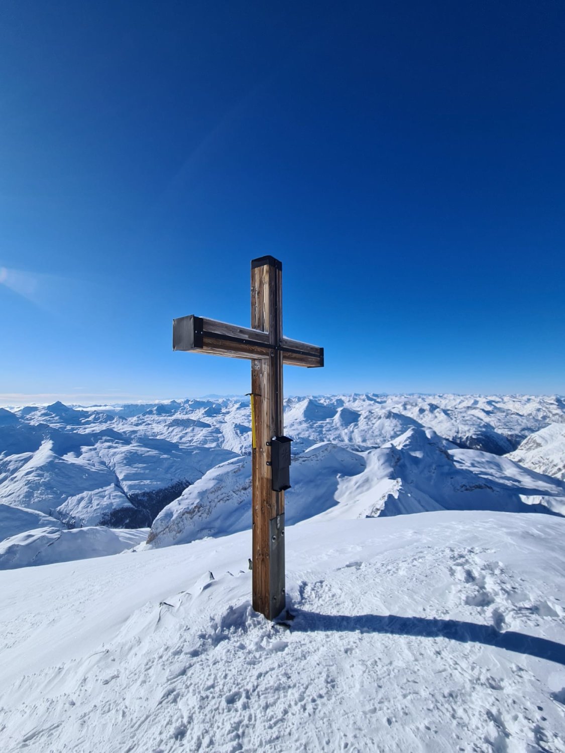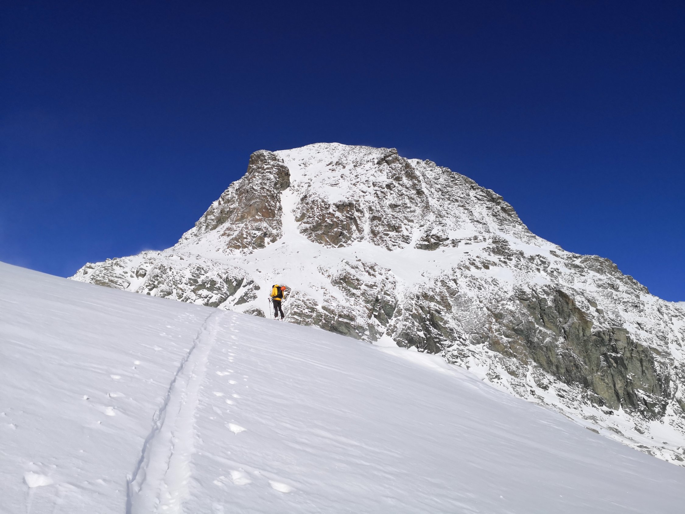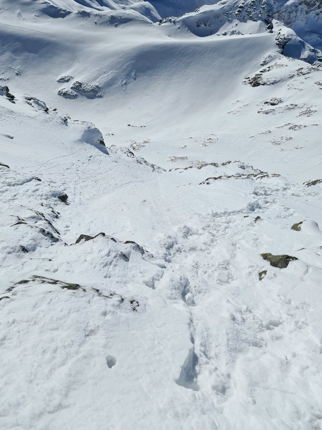 Zwischenabfahrt von Muttans noch mit wenig Schnee und vielen Steinen. Gipfel über Sommerroute mit Steigeisen und Pickel ohne Probleme erreicht.