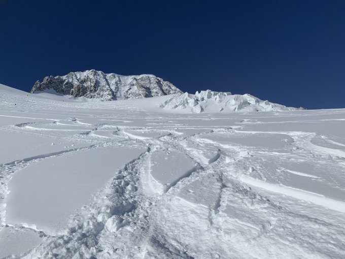Abfahrt dann Top Powder bis zur Zunge des Tiefengletschers. Aufstieg zur Unteren Bielenlücke ebenfalls auf guter Spur, bereits recht verfahrenes Gelände. Westseitig Richtung Sidelenbach eher schlecht eingeschneit, bei vorsichtiger Fahrweise dennoch genussvoll fahrbar, bester Powder.