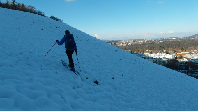 Sonnenschein und Pulver! Ausreichend Schnee für den Aufstieg. Abfahrt im Pulverschnee im oberen Bereich der Route. Im unteren Bereich holperts - Stein-Skier oder Schlitten mitbringen! Hänge generell unbefahren, es hat noch Platz für weitere Firstlines!