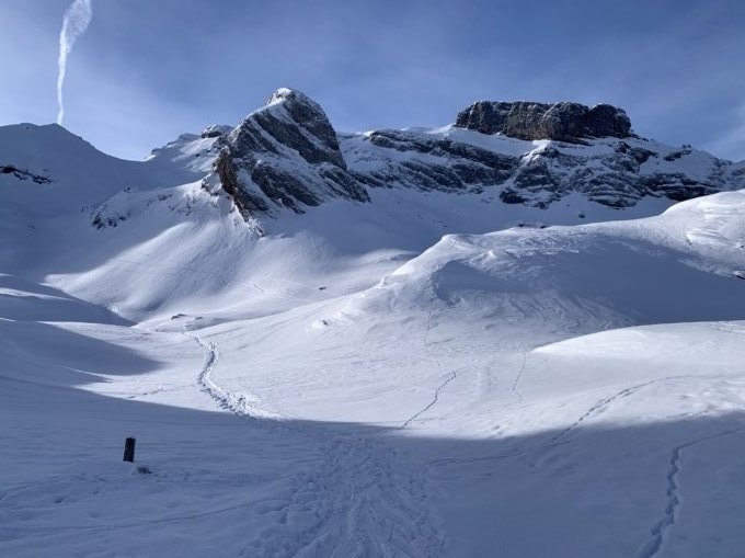 Aufstieg auf eingeschneiter Spur, unten genügend Schnee, oberhalb Achslen zT steinig. Gipfelhang rund 15 cm Neuschnee.
